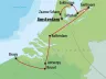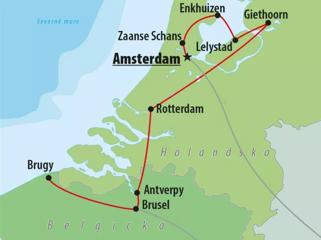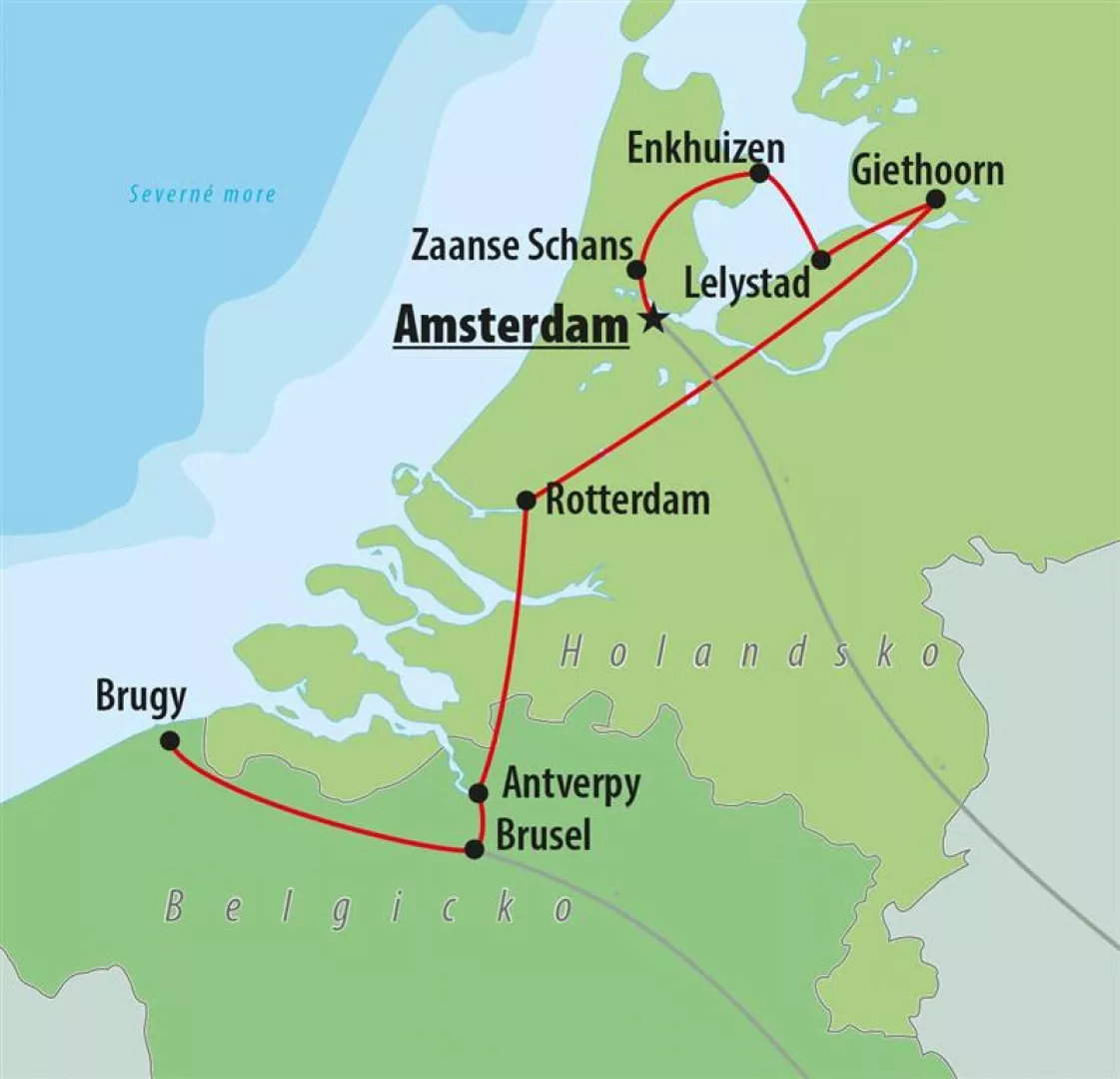Brusel, Bruggy, Antverpy, Rotterdam, Giethoorn, Lelystad, Enkhuizen, Zaanse Schans, Amsterdam.