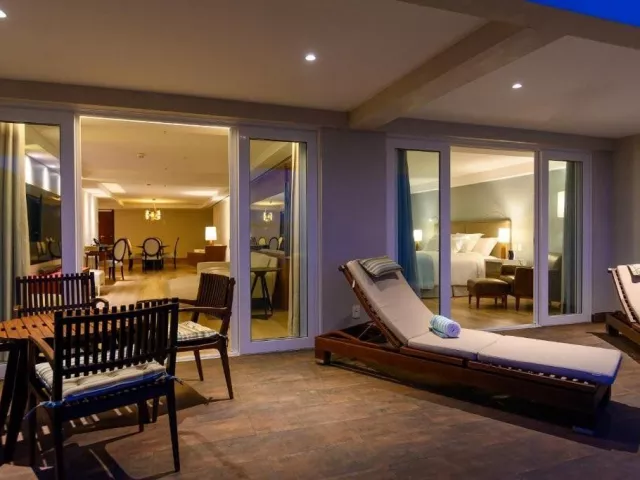 Suite Premium: Zahrnují ložnici s manželskou postelí, obývací část, a koupelnu s vanou a sprchovým koutem, fénem, župany a značkovými doplňky. Suity mají vlastní balkon s výhledem na moře a jsou vybaveny luxusními prvky, jako jsou špičková postelní prádla, kávovar, minibar s prémiovým alkoholem, dockovací stanice JBL či Smart TV. Velikost pokoje je 64 m². Apartmán Luxury : Kromě ložnice s manželskou postelí obsahuje také obývací prostor, kuchyňský kout a větší balkon s výhledem na oceán. Velikost pokoje je 64 m².