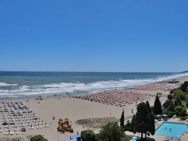Pred hotelom sa rozprestiera krásna piesočnatá pláž s pozvoľným vstupom do mora. 1. a 2. rad lehátok so slnečníkmi je za poplatok, od 3. radu sú 2 lehátka a 1 slnečník na izbu zdarma.