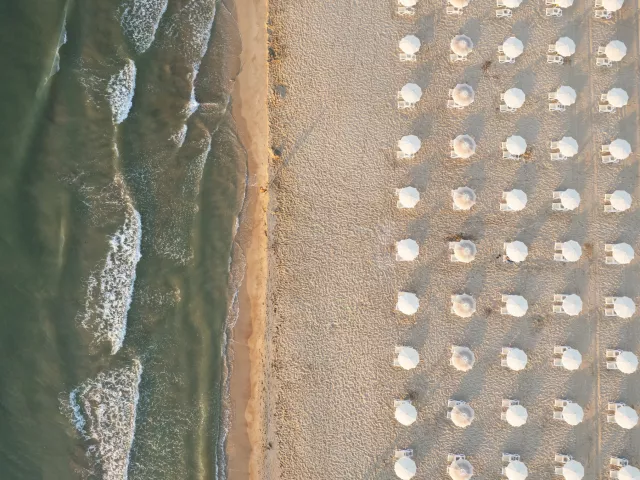 Piesočnatá pláž ocenená Modrou vlajkou len cez promenádu, v sektore určenom pre hotel od 3. radu 2 ležadlá a slnečník/izba zadarmo (podľa dostupnosti). V 1. a 2. rade najbližšie k moru ležadlá a slnečníky za poplatok. Plážové osušky za vratnú zálohu.