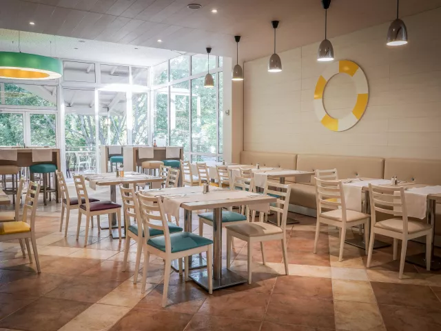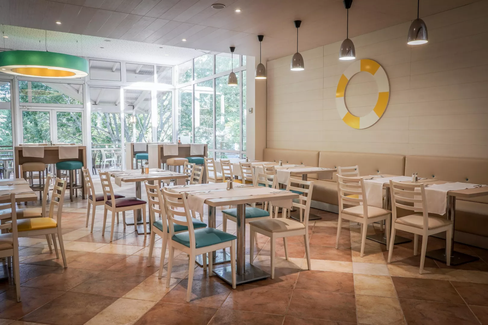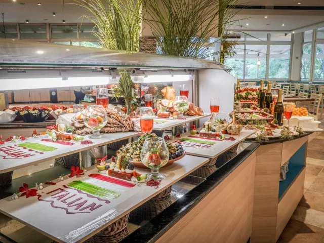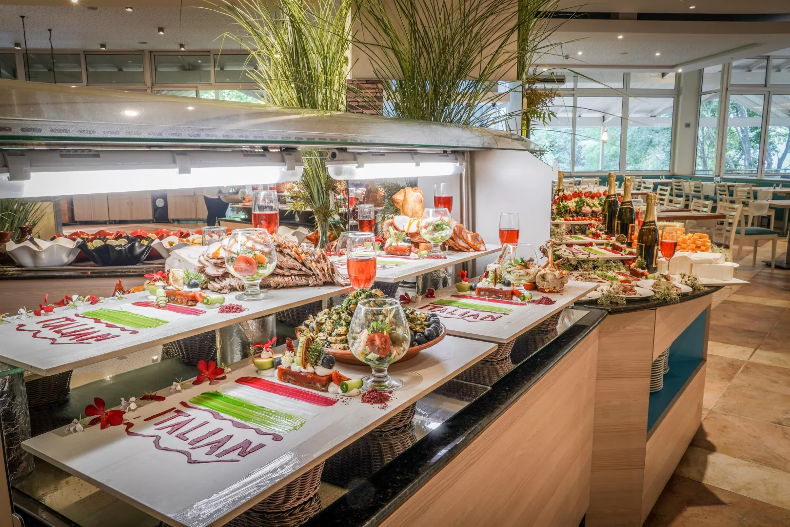 All inclusive zahŕňa raňajky (07:30-10:00), obedy (12:30-14:30) a večere (18:00-21:00) formou bufetu, občerstvenie počas dňa a nealkoholické aj alkoholické nápoje miestnej výroby v stanovených časoch a miestach. Plážový bar RAI je v cene od 10:00 do 17:00 (od 1.6. do 15.9.) a plážová reštaurácia Ray ponúka obedy od 12:30 do 14:30 (od 15.6. do 15.9.).