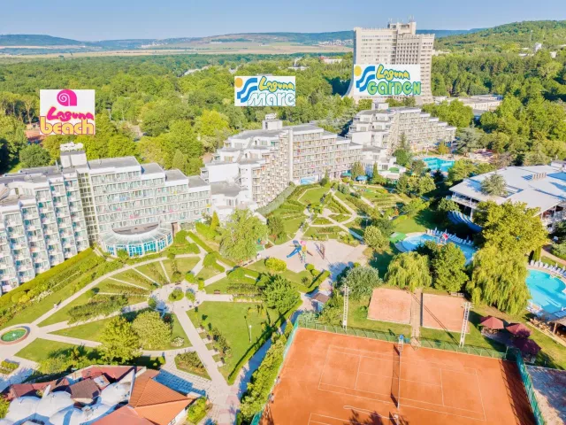 Hotelový komplex Laguna Mare sa nachádza v pitoresknej ružovej záhrade, pričom je vzdialený len 100 metrov od pláže. V blízkosti sa nachádza množstvo nákupných možností a zábavných podnikov, čo zabezpečuje ideálnu polohu pre letnú dovolenku.