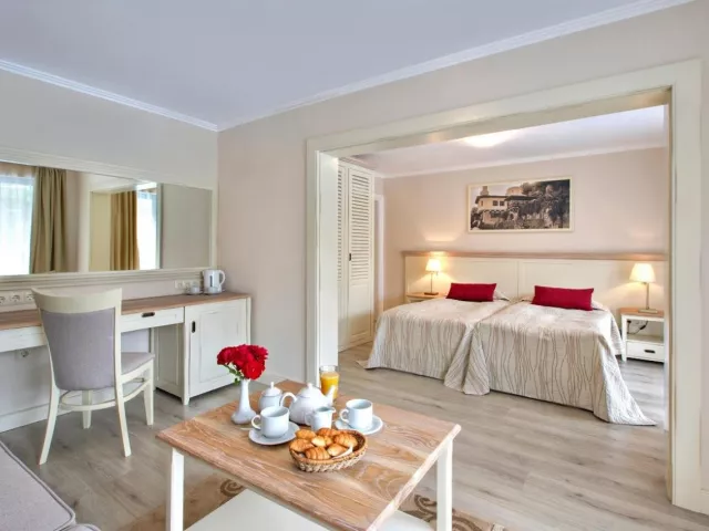 Dvojlôžková izba klimatizácia telefón káblová TV trezor (zadarmo) minibar (za poplatok) Wi-Fi (zadarmo) vlastné sociálne zariadenie (kúpeľňa, sušič vlasov, WC) Ostatné typy izieb (pokiaľ nie je uvedené inak, majú izby vyššie uvedené vybavenie) Štúdio: priestranná miestnosť s kuchynským kútom a obývacou časťou Junior Suita, Výhľad na park: priestranná miestnosť s obývacou časťou Junior Suita, Výhľad na more: priestranná miestnosť s obývacou časťou, výhľad na more Suita, 1 spálňa: obývacia časť s kuchynským kútom, oddelená spálňa