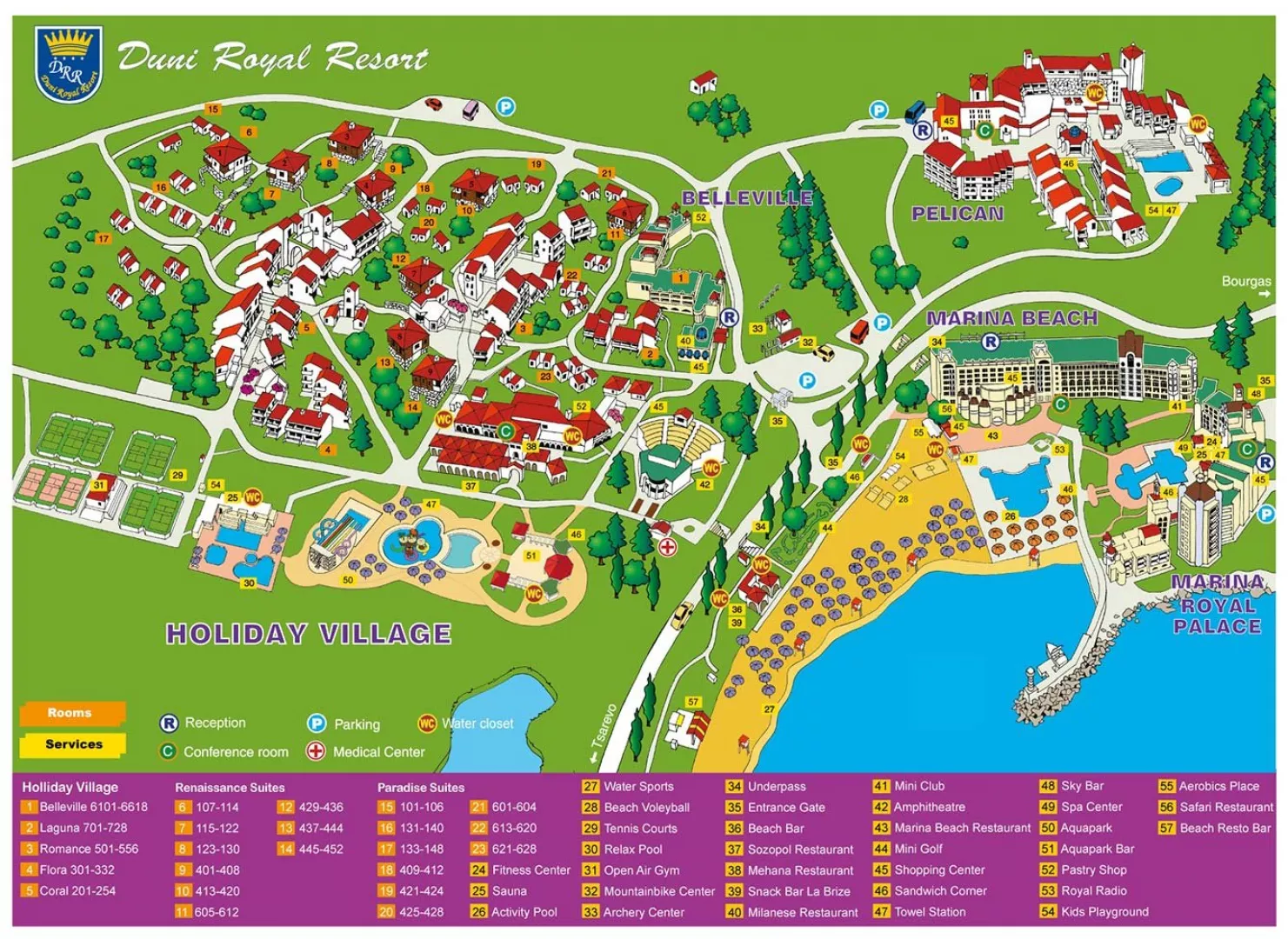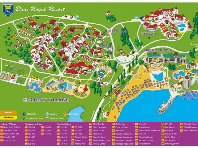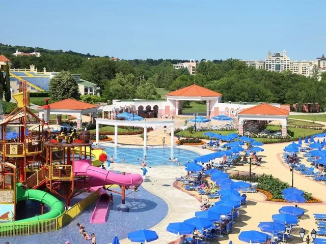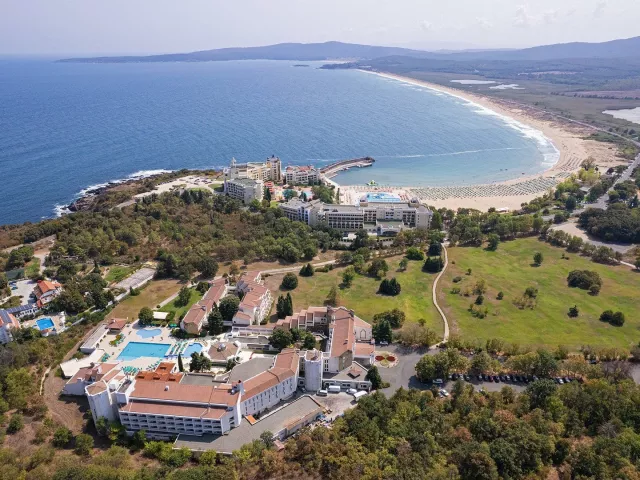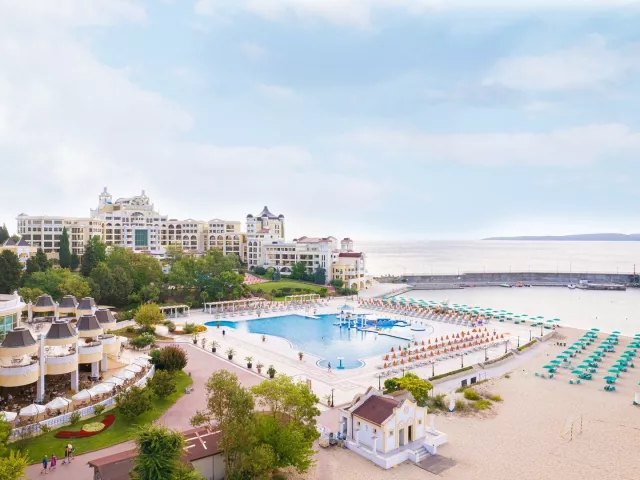 Hotel Marina Royal Palace sa nachádza v komplexe Duni, ktorý patrí k najmodernejším letoviskám v Bulharsku. Rozkladá sa v príjemnej zátoke pri pláži a je obklopený zeleňou, blízko prírodnej rezervácie Ropotamo. Komplex pozostáva z piatich luxusných hotelov a ponúka služby na vysokej úrovni, vrátane All Inclusive, ktoré sú dostupné aj v ostatných hoteloch v areáli.