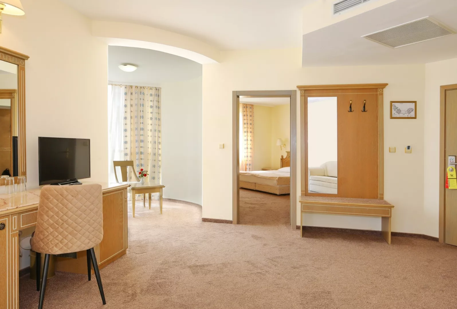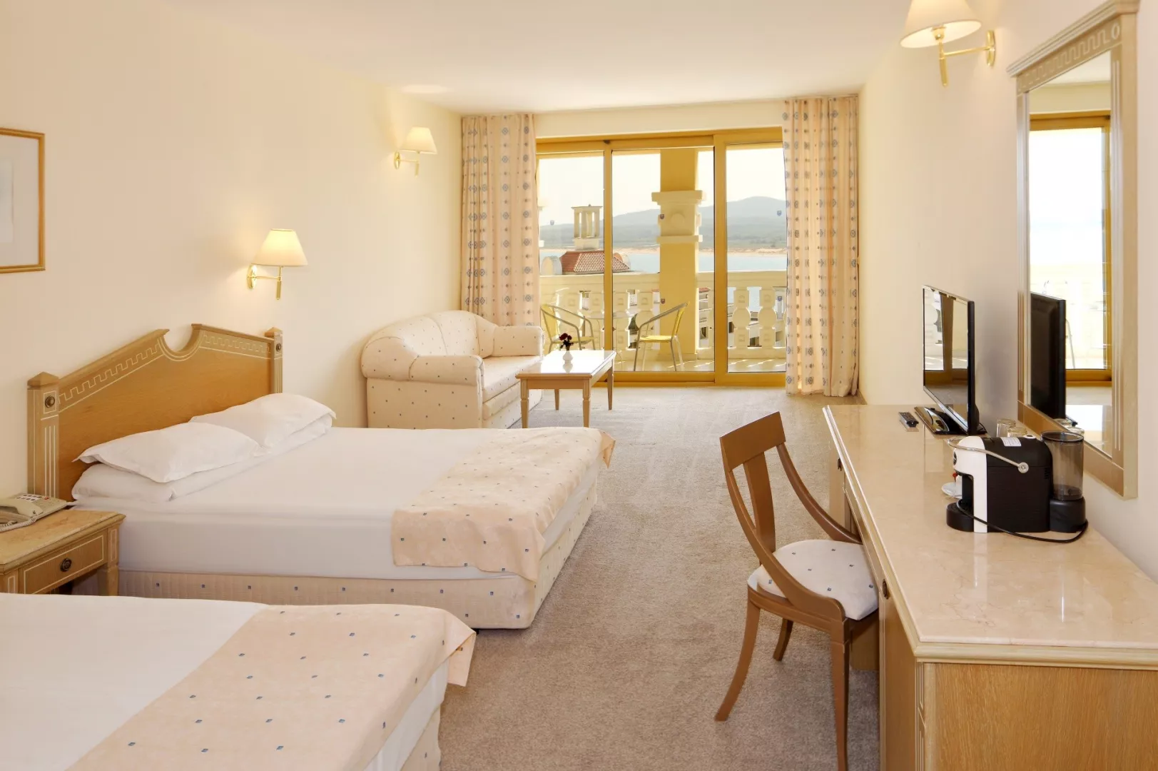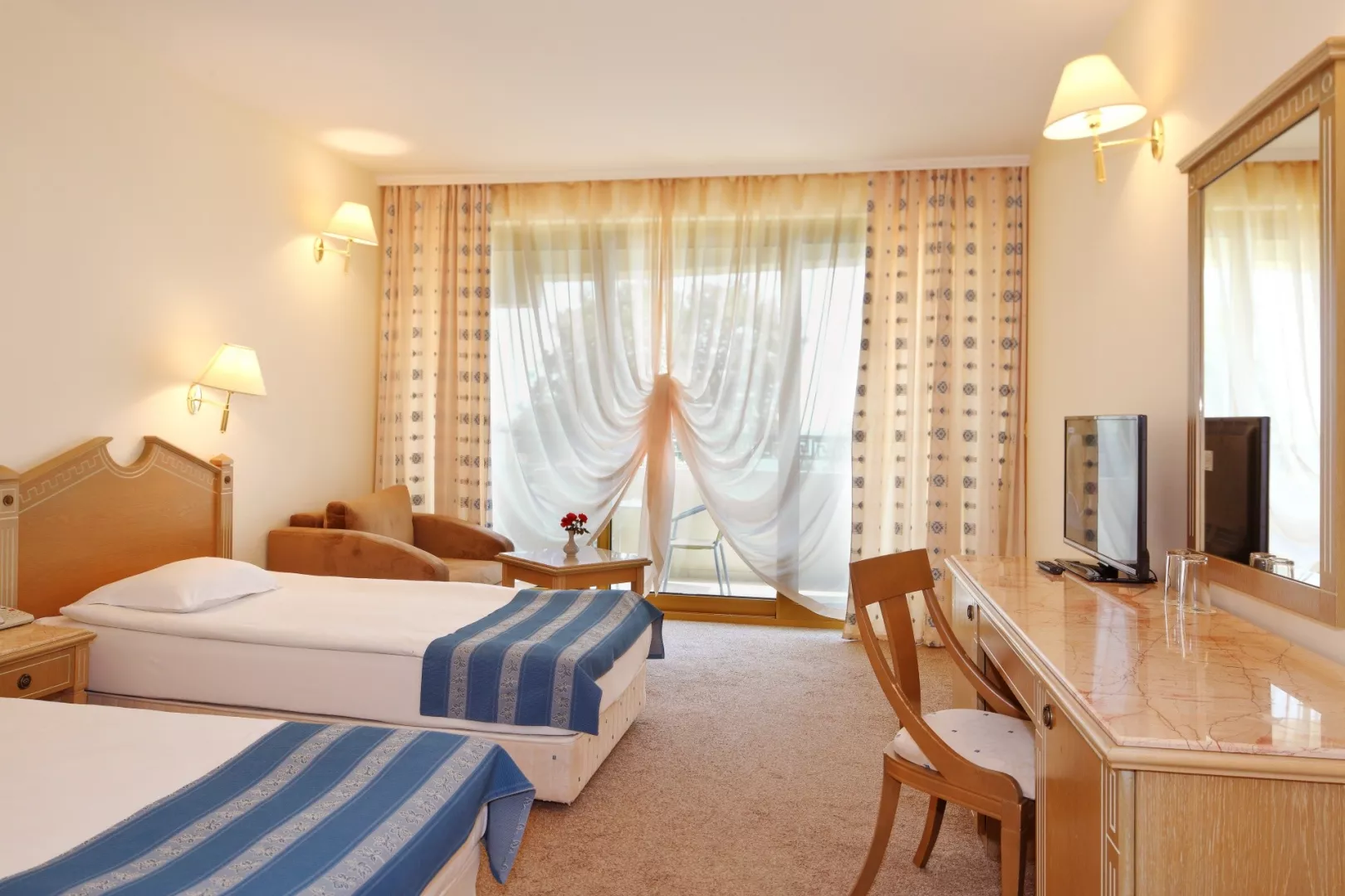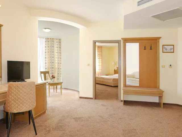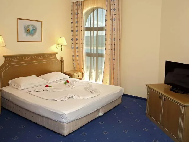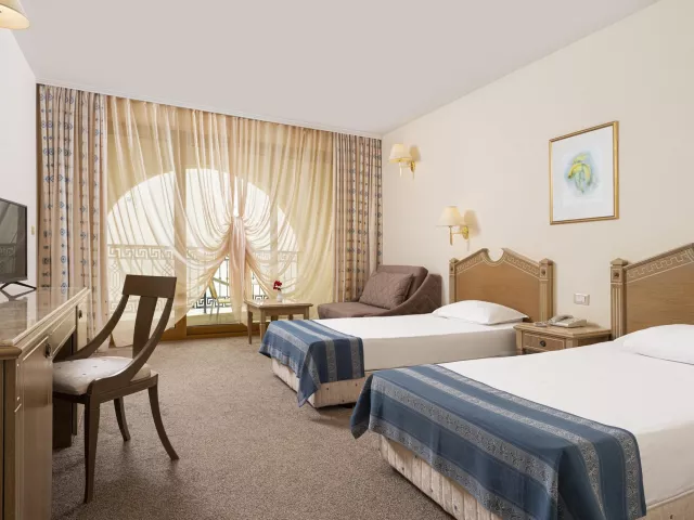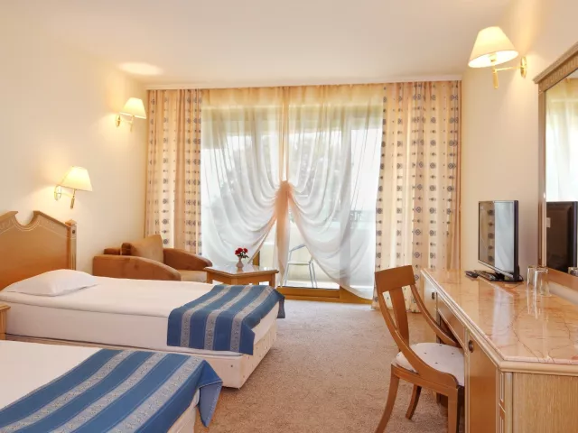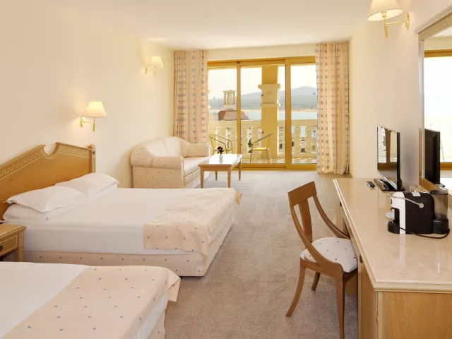Dvojlôžková izba klimatizácia (15.6.–15.9.) TV/SAT minibar (za poplatok) kúpeľňa/WC (sušič vlasov) trezor (za poplatok) balkón alebo terasa Ostatné typy izieb (pokiaľ nie je uvedené inak, majú izby vyššie uvedené vybavenie) Dvojposteľová izba, Výhľad bazén: výhľad na bazén Dvojposteľová izba, Výhľad mora: výhľad na more Junior Suita, Výhľad park: priestrannejší, výhľad na okolie hotela Junior Suita, Výhľad bazén: priestrannejší, výhľad na bazén Junior Suita, Výhľad mora: priestrannejší, výhľad na more Suita, Výhľad bazén: oddelená spálňa a obývacia izba, výhľad na bazén Suita, Výhľad mora: oddelená spálňa a obývacia izba, výhľad na more