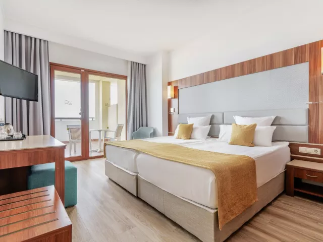 Dvojlôžková izba, Výhľad na more: centrálna klimatizácia, TV/SAT, telefón, Wi-Fi (zadarmo), minichladnička, trezor (za poplatok), kúpeľňa/WC (sušič vlasov), balkón alebo terasa Ostatné typy izieb (pokiaľ nie je uvedené inak, majú izby vyššie uvedené vybavenie) Dvojlôžková izba, Superior, Výhľad park: priestrannejšie, rozkladacia pohovka, výhľad do parku Dvojlôžková izba, Superior , Výhľad na more: priestrannejšie, rozkladacia pohovka, výhľad na more Rodinná izba, Výhľad na more: 2 izby, výhľad na more Dvojlôžková izba ,Club ,Výhľad na more: My Favorite Club služby*, výhľad na more Dvojlôžková izba ,Club, Superior ,Výhľad na more: priestrannejší s rozkladacou pohovkou, výhľad na more, My Favorite Club služby* *MY FAVORITE CLUB výber tých najlepších izieb rozšírená ponuka toaletných potrieb rýchlovarná kanvica so sadou na prípravu kávy a čaju kávovar na kapsule izbový trezor zadarmo šľapky uvítací minibar s nealkoholickými napojmi, fliaš vody a pivom pillow menu (na vyžiadanie) fľaša sektu a uvítacie menu pri check-ine rezervované miesta v hlavnej reštaurácii a pri hlavnom bazéne prístup do My Favorite Club salóniku (občerstvenie a nealkoholické nápoje v priebehu dňa)