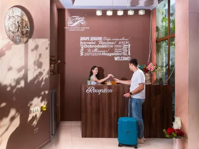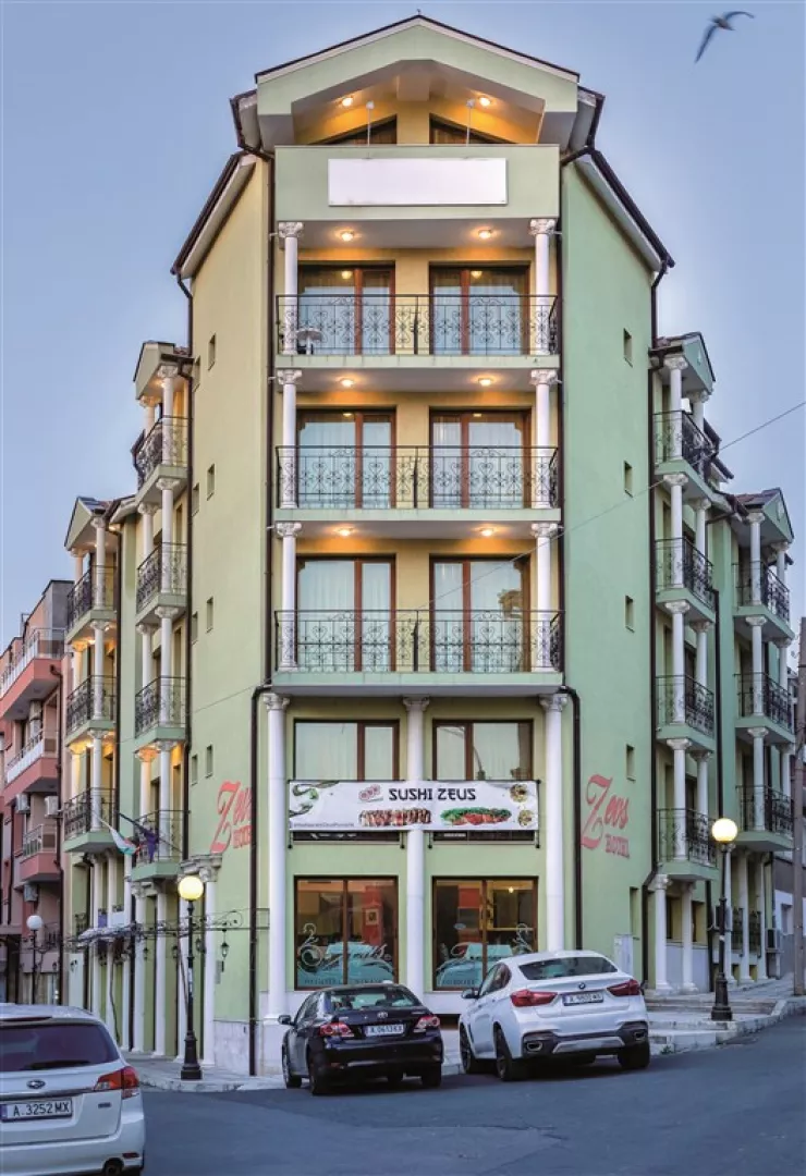 Menší rodinný hotel Zeus leží v blízkosti starej časti strediska Pomorie a je zrekonštruovaný v elegantnom štýle. Je vhodný pre všetky vekové kategórie a rodiny s deťmi. Známy je svojou pohostinnosťou a má veľa stálych klientov, ktorí sa do tohto hotela radi vracajú. V blízkosti sa nachádza množstvo obchodíkov, reštaurácií a barov. Krátka prechádzka vedie do centra Pomoria, kde sa nachádzajú atrakcie pre dospelých i deti, ktoré sú dostupné vo večerných hodinách.
