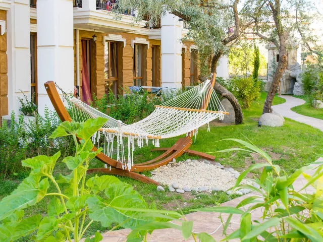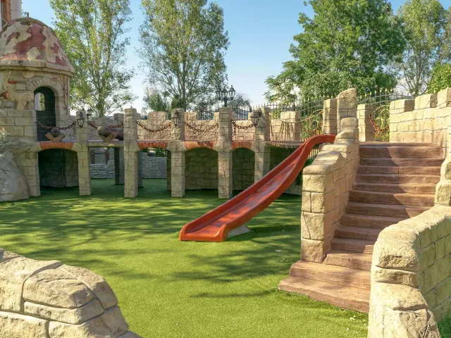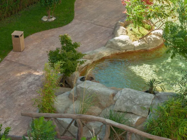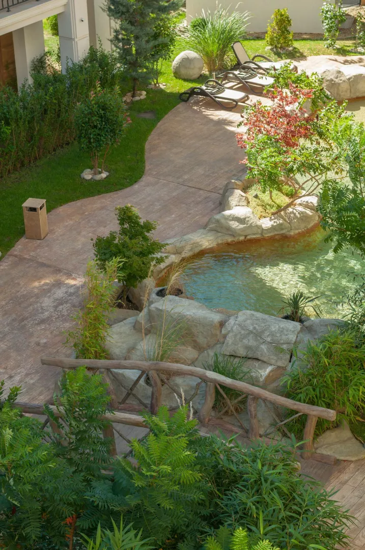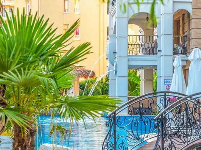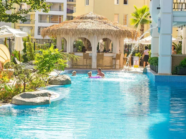 zelený park so záhradným nábytkom a altánkami reštaurácia hlavný bazén s ležadlami a slnečníkmi detský bazén bar pri bazéne (len nápoje) vírivka volejbalové ihrisko dekoratívna lagúna detské ihrisko