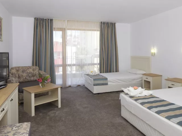 Hotel Mena Palace sa nachádza priamo v centre Slnečného pobrežia, len 150-250 m od pláže a blízko nákupných a zábavných možností. Letisko Burgas je vzdialené približne 25 km, čo zaručuje ľahký prístup na ubytovanie.