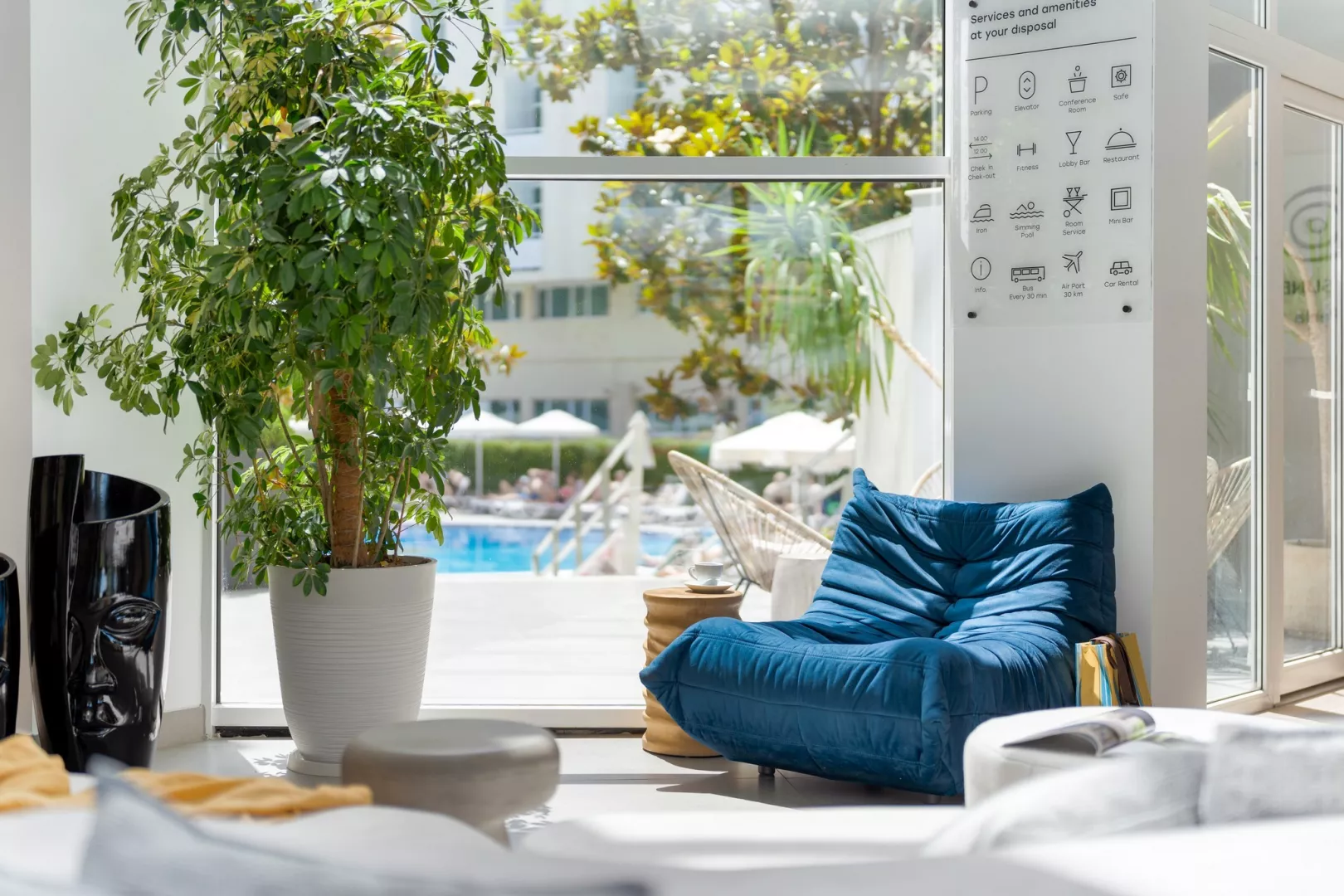 Vstupná hala s recepciou, reštaurácia, lobby bar, bar pri bazéne, bazén (ležadlá a slnečníky zadarmo), trezor na recepcii (za poplatok)
