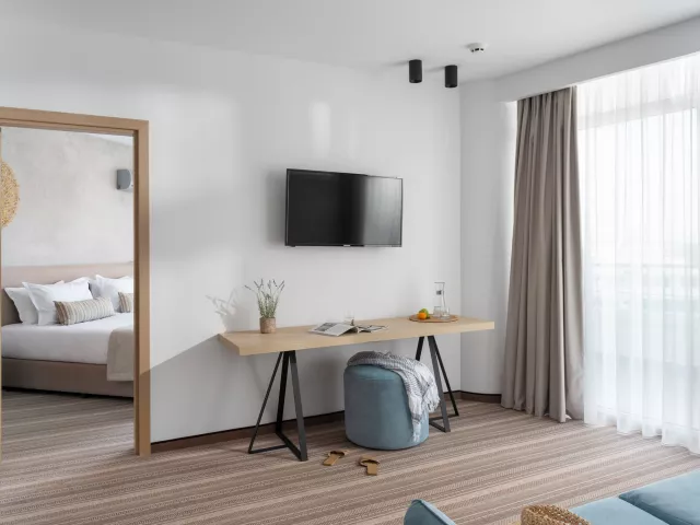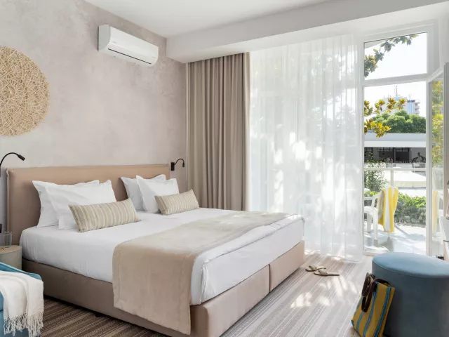 Dvojlôžková izba: kúpeľňa/WC (sušič vlasov), klimatizácia, TV/sat., telefón, minichladnička, balkón alebo terasa Ostatné typy izieb (pokiaľ nie je uvedené inak, majú izby vyššie uvedené vybavenie) Dvojlôžková izba, Deluxe: možnosť jednej prístelky Štúdio: priestrannejšie Apartmán: spálňa a obývacia izba oddelené dverami