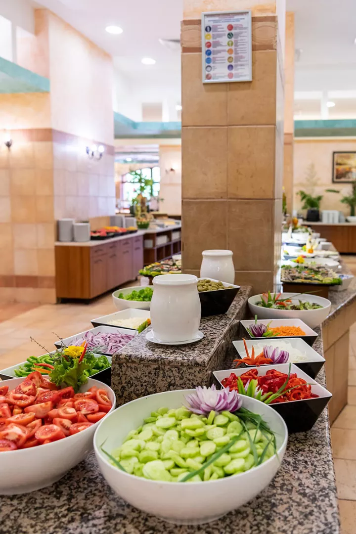 Hotel ponúka stravovanie all inclusive, ktoré zahŕňa raňajky, obedy a večere formou bufetu, ako aj ľahké občerstvenie počas dňa a vybrané miestne nealkoholické a alkoholické nápoje. Časy podávania jedál sú stanovené hotelom a môžu sa meniť.