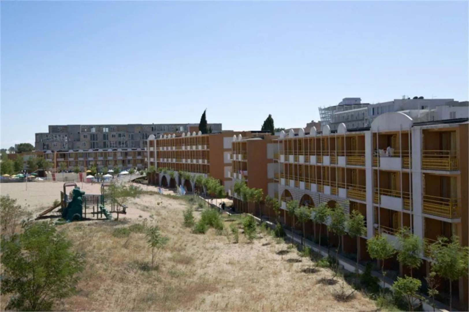 Komplex Nessebar Beach pozostáva z dvoch prepojených budov a nachádza sa v južnej časti letoviska. Od piesočnatej pláže ho delí len krátky chodník. Vzdialenosti sú nasledovné: pláž 50 m, centrum letoviska 800 m, a letisko 30 km.