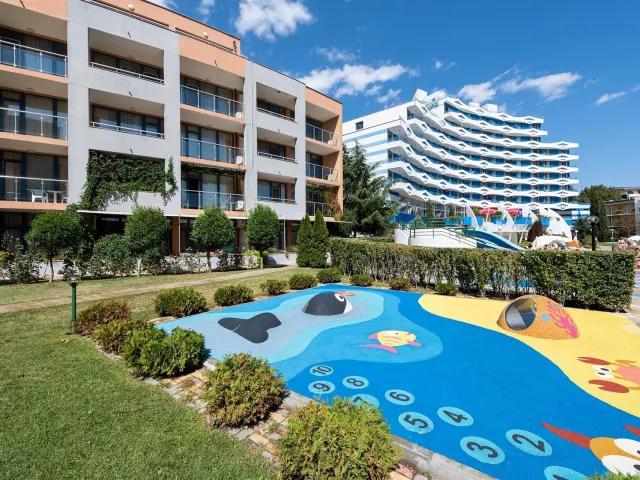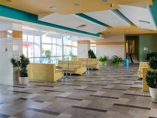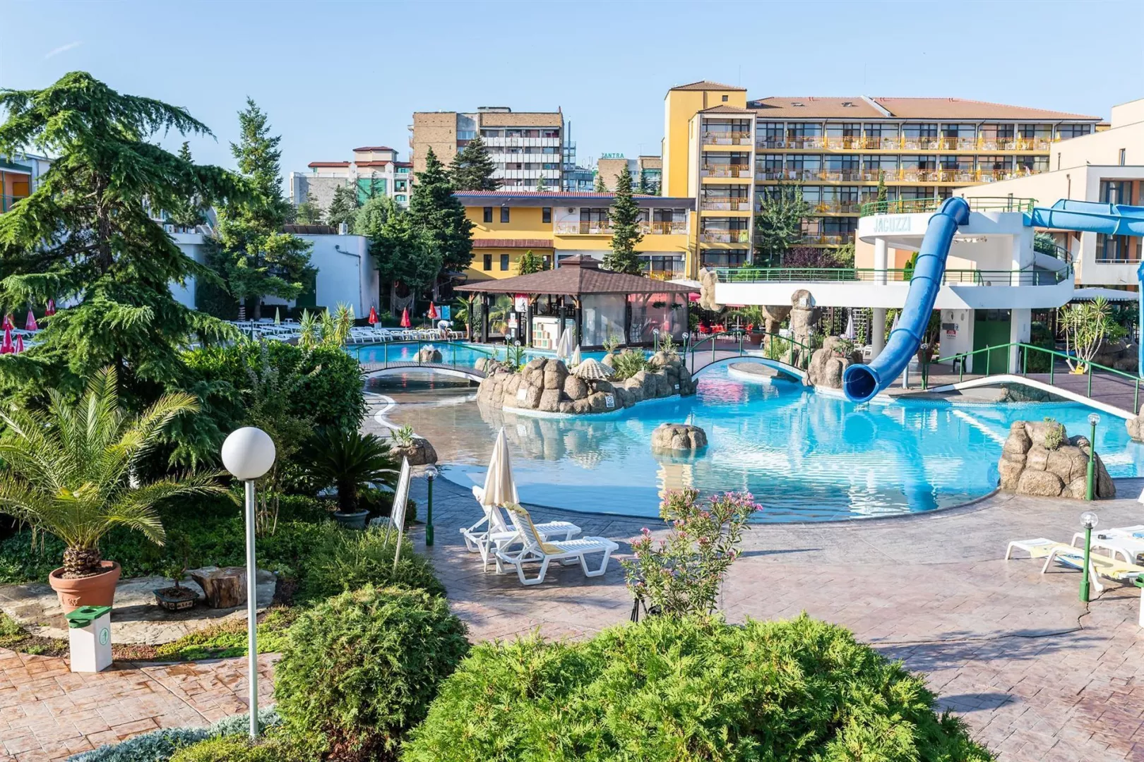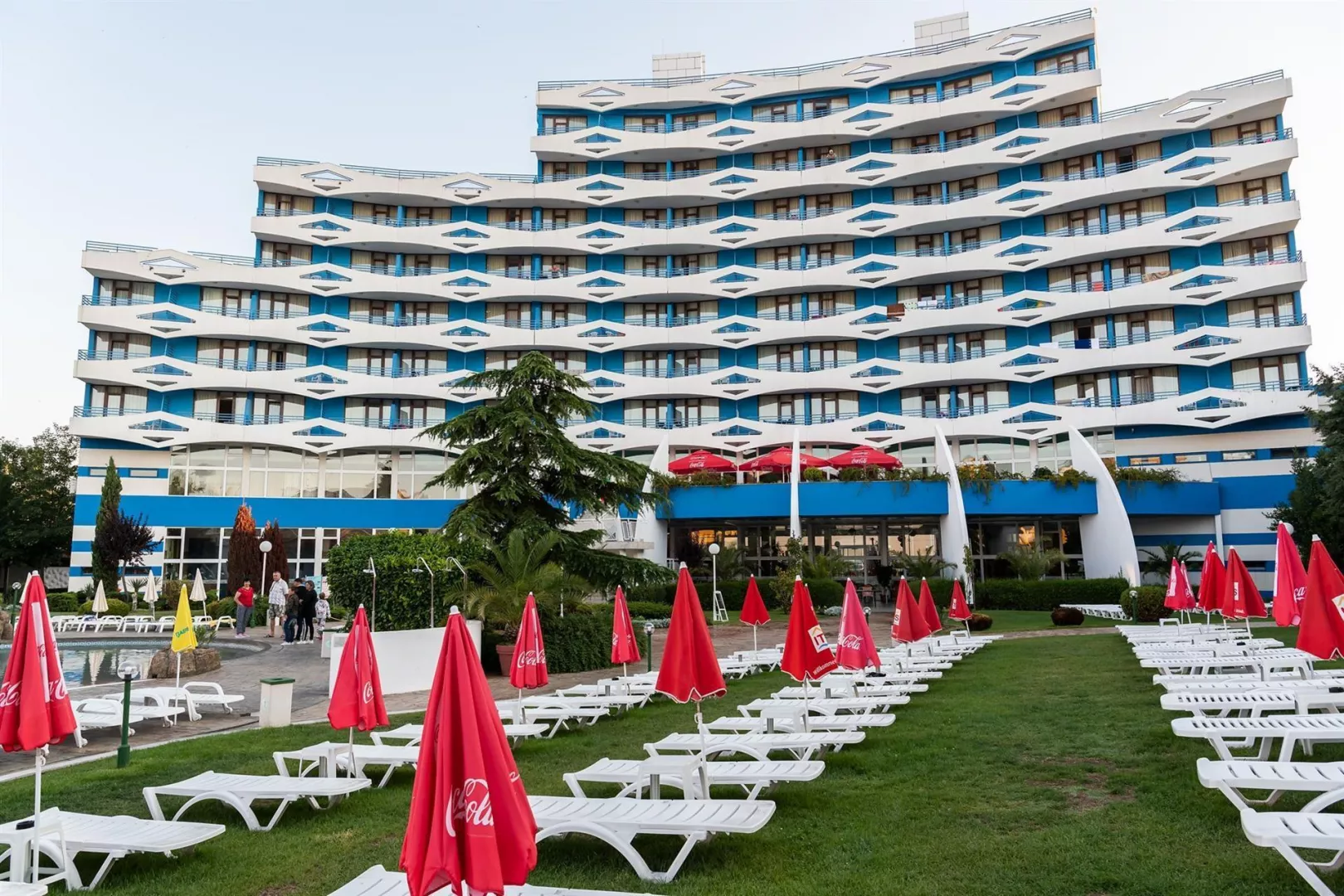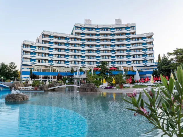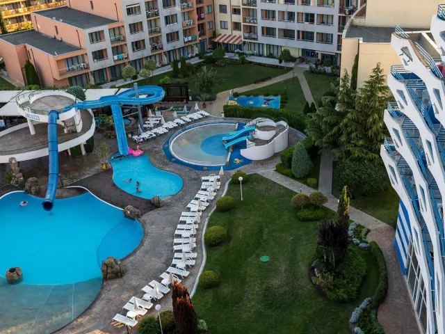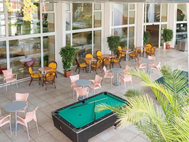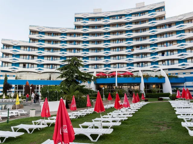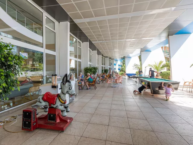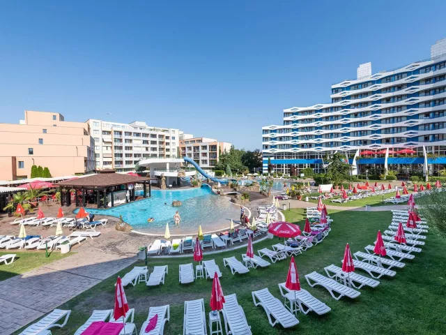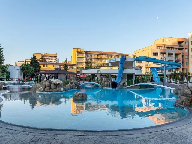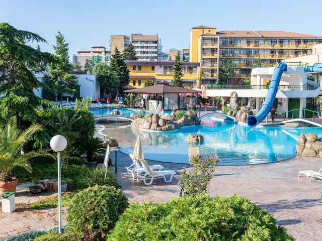Hotel má jedinečnú deväťposchodovú budovu, pozostávajúcu zo 169 izieb, ktoré sú vybavené klimatizáciou, televízorom a balkónom. K dispozícii sú aj modernizované izby Comfort. V hoteli nájdete recepciu s trezorom, bar pri bazéne, lobby bar, reštauráciu s vonkajšou terasou a zmenáreň. Vonku sa nachádza bazén s tobogánmi, vírivkou a detským bazénom. Pre pohodlie sú pri bazéne bezplatne k dispozícii lehátka a slnečníky.