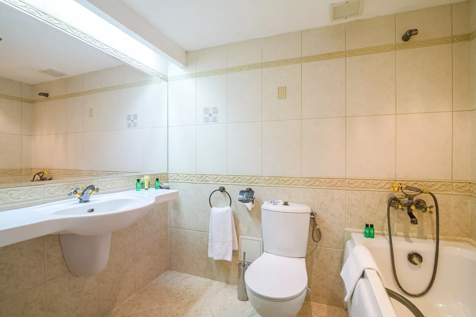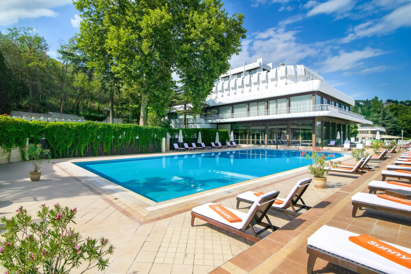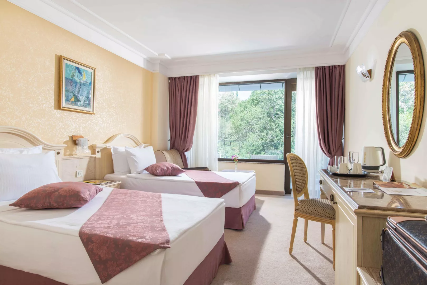 Dvojlôžkové izby sú vybavené kúpeľňou/WC (so sušičom vlasov), centrálnou klimatizáciou, TV/SAT, telefónom, minibarom (za poplatok), setom na prípravu kávy a čaju a balkónom. K dispozícii sú rôzne typy izieb: s výhľadom na park alebo na more, vrátane priestrannejších izieb Deluxe s obývacou časťou.