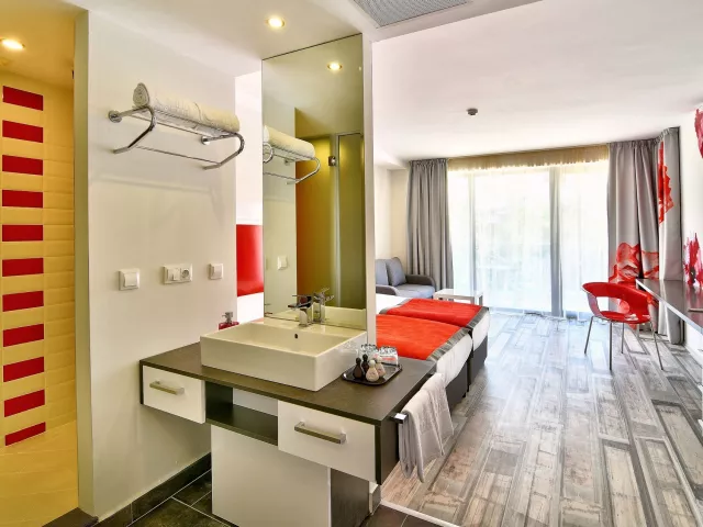 Hotel Grifid Foresta, určený len pre dospelých (16+ rokov), sa nachádza v pokojnej lokalite približne 800 m od centra letoviska a 30 km od letiska Varna. Autobusová zastávka je vzdialená len 20 m od hotela.