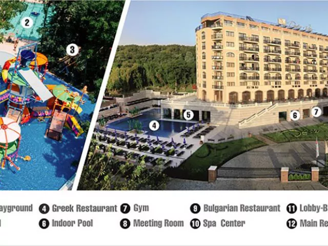 Rezort ponúka vstupnú halu s recepciou, hlavné reštaurácie s terasou, bulharskú a grécku reštauráciu, lobby bar s terasou, bar salón, snack bar pri bazéne a beach bar. K dispozícii sú aj dva bazény, vnútorný bazén, mini aqua park, slnečná terasa, wellness služby a zmenáreň. Slnečníky a ležadlá pri bazéne a na pláži sú zadarmo. V areáli sa nachádza aj detský klub, detské ihrisko, animácie pre deti a dospelých, ako aj večerné animačné programy. Wi-Fi je k dispozícii vo verejných priestoroch.