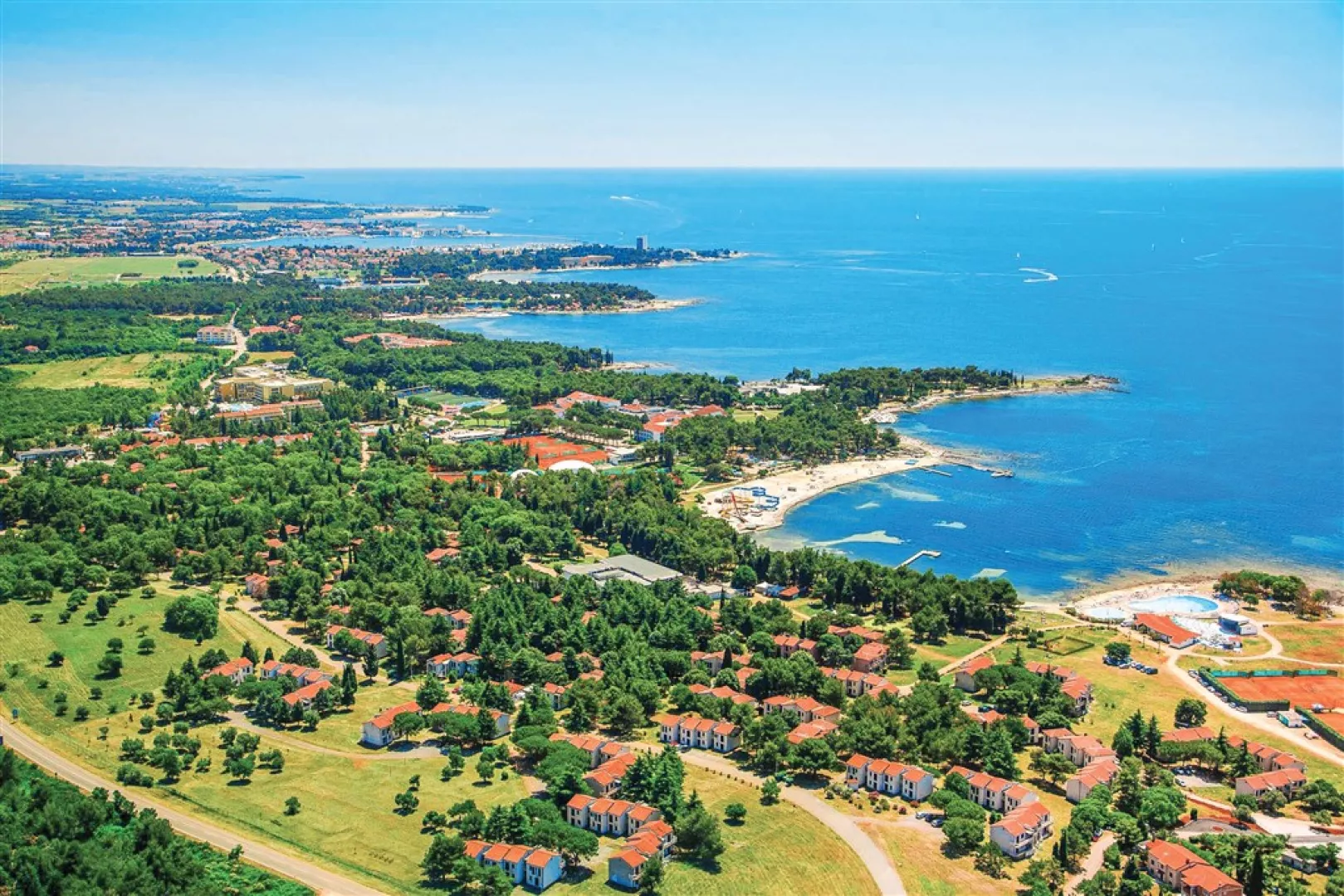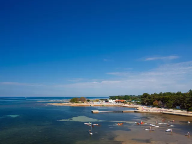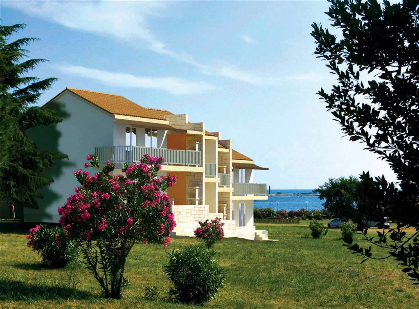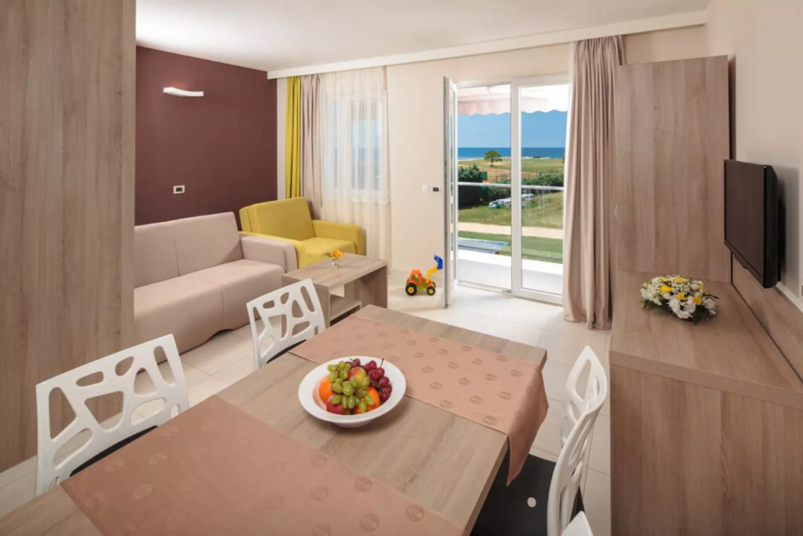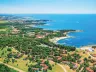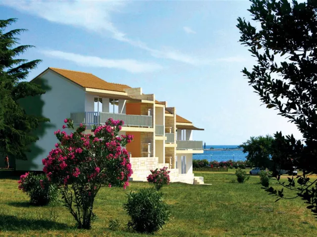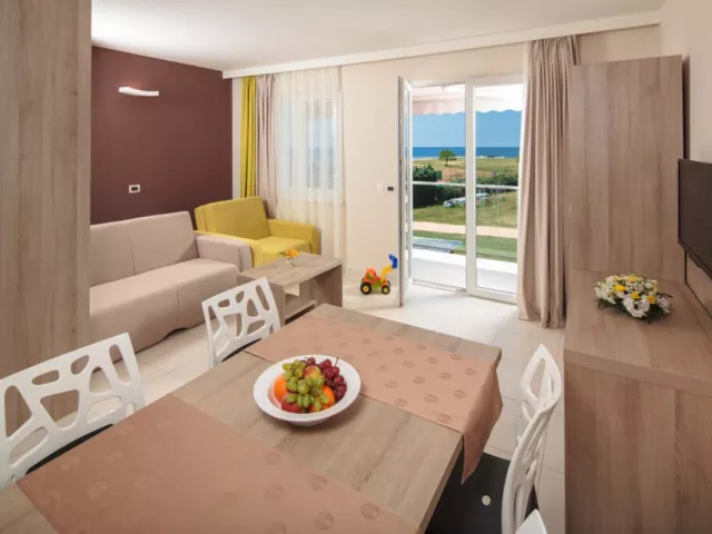 Moderné apartmány sú umiestnené v borovicovom háji blízko morské pobrežia, s vzdialenosťou cca 50 až 250 m od mora. Pláž je čiastočne kamenistá a ponúka upravené betónové plochy na slnenie, pričom ležadlá a slnečníky sú k dispozícii za príplatok. Na pláži sú tiež sprchy.
