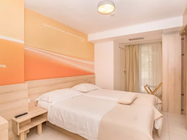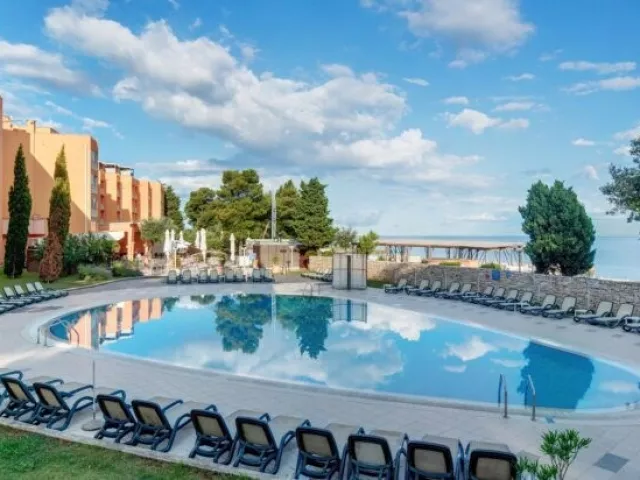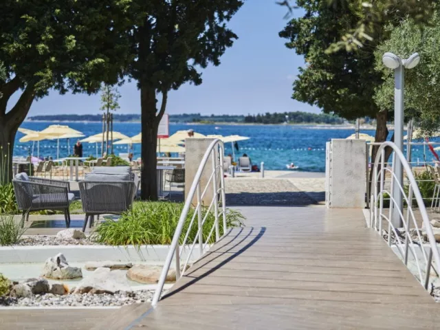 Residence je súčasťou hotelového komplexu priamo pri mori, v blízkosti obľúbeného hotela Umag. Pláž je prírodná, čiastočne kamenistá, upravená s plochami na slnenie. Ležadlá a slnečníky sú na pláži k dispozícii zdarma (v obmedzenom počte).
