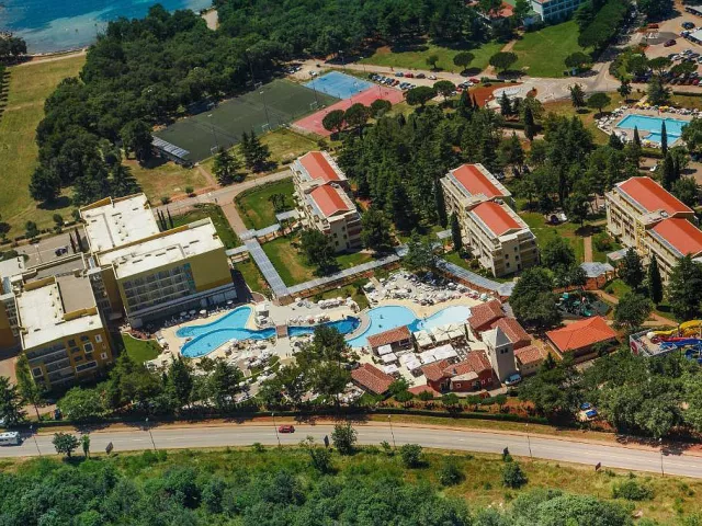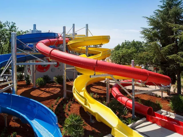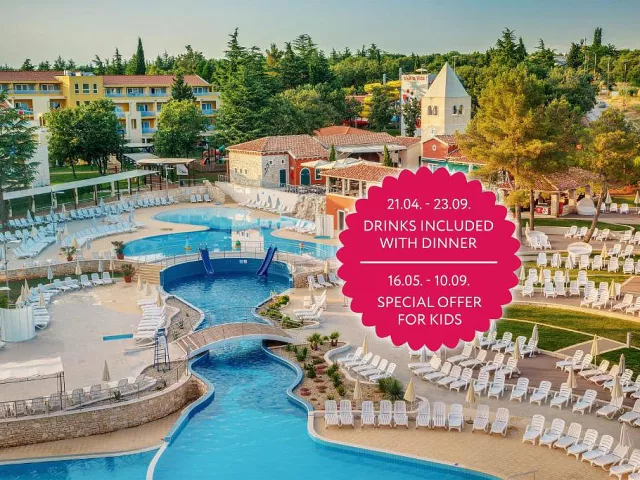 vonkajší bazén s vodopádmi a vodnými atrakciami, úschovňa bicyklov, šmýkľavky (miniaquapark na ploche 1410 m²), detský bazén, vnútorný bazén (uzavretý od 17.07. do 15.09.), wellness centrum – vnútorný bazén, whirlpool*, sauna* (turecká, 2× fínska, soľná), masáže*, fitness, tenisové kurty*, stolný tenis*, minigolf*, plážový volejbal*, ihrisko na loptové hry*, animácie, vodné športy*, jazdecké centrum*, požičovňa* a úschovňa bicyklov, turistický vláčik (každých 30 min.) do mesta Umag; animačné programy pre deti i dospelých, večerné show, živá hudba, kino pod holým nebom (17.07.–31.08.), astro dielňa a pozorovanie hviezd (1× týždenne, 17.07.–04.09.), detské kluby: Pepi Club Baby (8 mesiacov–4 roky), Pepi Club Kids (4–12 rokov), Games Room (od 8 rokov), Soft Play herňa (0–12 rokov), trampolínový park, senzorická miestnosť, škola plávania (17.07.–15.09.) * služby za príplatok