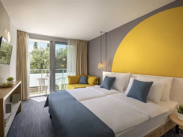 Dvojlôžkové klimatizované izby (19 m²), s možnosťou prístelky (rozťahovacie kreslo), sú vybavené sprchou/WC, SAT TV, telefónom, fénom a balkónom orientovaným do parku alebo na morskú stranu.