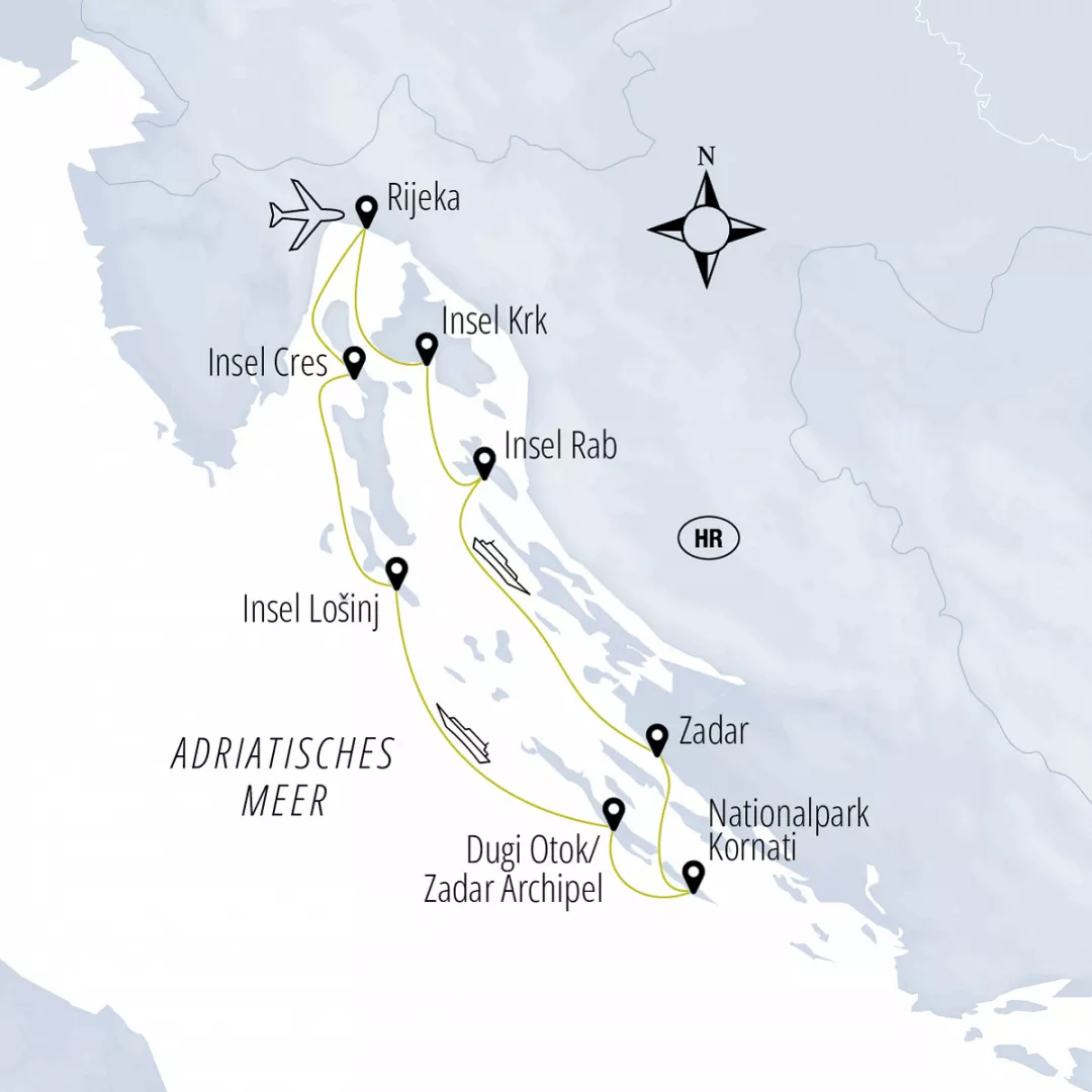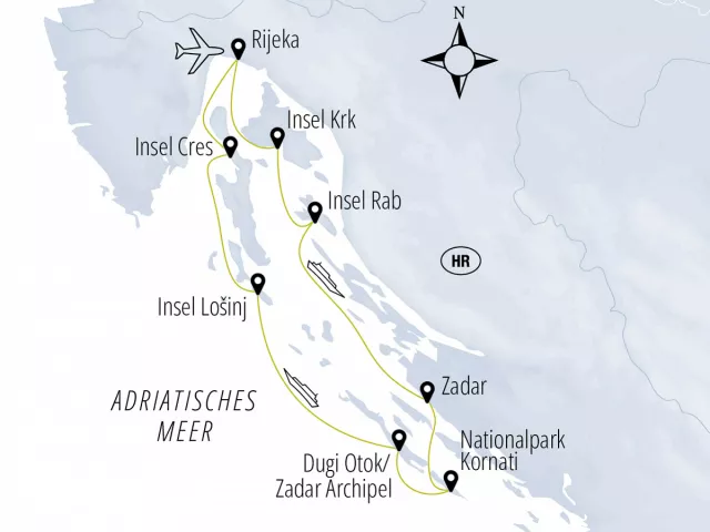 ITINERÁR: Sobota: Rijeka – ostrov Krk Nedeľa: ostrov Krk – ostrov Rab Pondelok: ostrov Rab - Zadar Utorok: Zadar – NP Kornati – Zadarské súostrovie Streda: Zadarské súostrovie – ostrov Lošinj Štvrtok: ostrov Lošinj – ostrov Cres Piatok: ostrov Cres – Rijeka Sobota: vylodenie