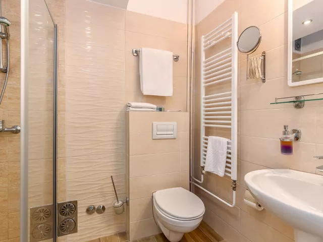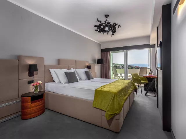 Moderné klimatizované izby sú rôznych typov: STANDARD izby s francúzskym balkónom orientované na parkovú stranu, SUPERIOR izby s balkónom orientované na more a PREMIUM izby s priamym výhľadom na more. Vybavenie izieb zahŕňa LCD TV/SAT, minibar, trezor, kúpeľňu so sprchou a sušičom na vlasy, ako aj možnosť prísteliek.