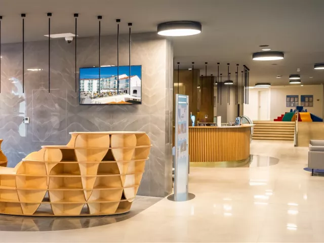 Hotel pozostáva z dvoch prepojených budov a ponúka recepciu, výťahy, priestrannú reštauráciu, bar, niekoľko bazénov so sladkou a morskou vodou, wellness centrum, fitness, detské ihrisko a rôzne športové aktivity. Pre najmenšie deti sú pripravené služby ako prebaľovací pult, baby phone a detský kočík na vyžiadanie.