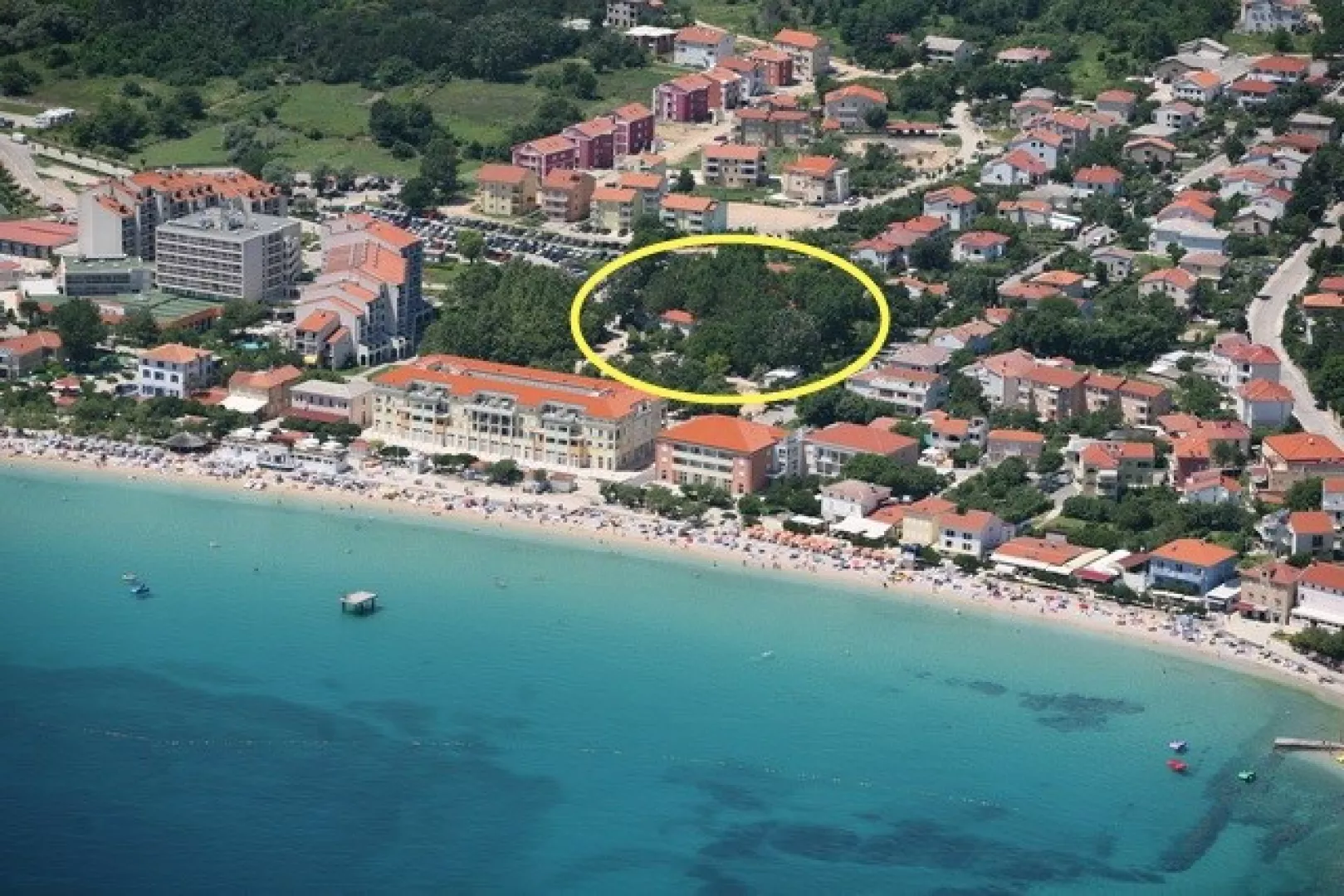 Apartmánový komplex sa nachádza približne 100 m od centra malebného mestečka Baška a iba 150 m od pláže „Vela Plaža“. Je situovaný v parku, ponúkajúcom pokoj a súkromie, pričom prímorská promenáda s množstvom reštaurácií, barov a obchodov je na dosah.