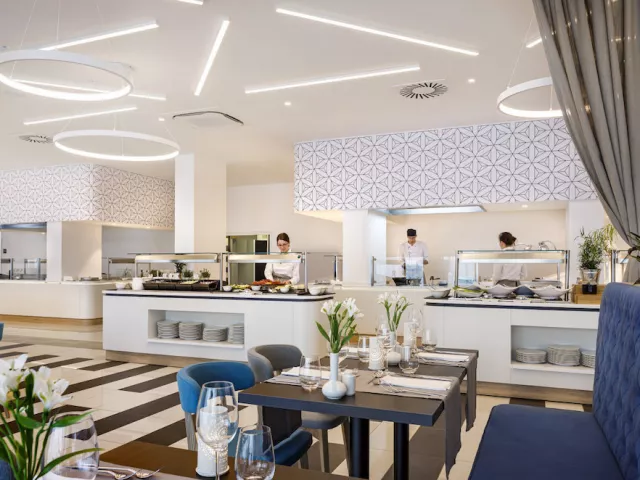 Stravovanie je zabezpečené formou polpenzie, s raňajkami a večerami podávanými formou bufetových stolov v reštaurácii Mediterraneo. K večeri sú dostupné nápoje za poplatok a pravidelné tematické večere ponúkajú tradičné špeciality. Počas pobytu je možnosť stravovania v á la carte reštaurácii Oliva Grill s krásnym výhľadom na more.