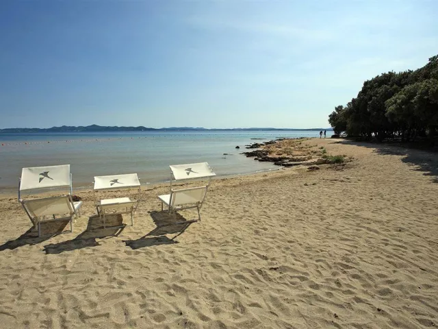 Upravená skalnatá a piesočnatá pláž je vhodná aj pre malé deti, s pozvoľným vstupom do mora a upravenými plochami na slnenie. Ležadlá a závesné siete sú k dispozícii zdarma.