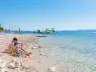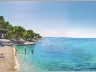 Pláž je kombináciou štrkových a skalnatých častí, s upravenými plochami na slnenie. Tiahne sa okolo celého polostrova a ponúka prírodný tieň borovíc. K dispozícii sú sprchy, ležadlá za poplatok a plážové bary.