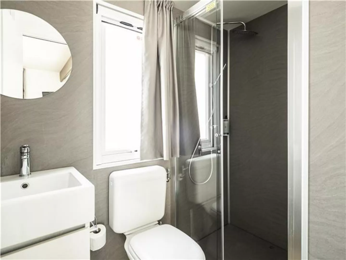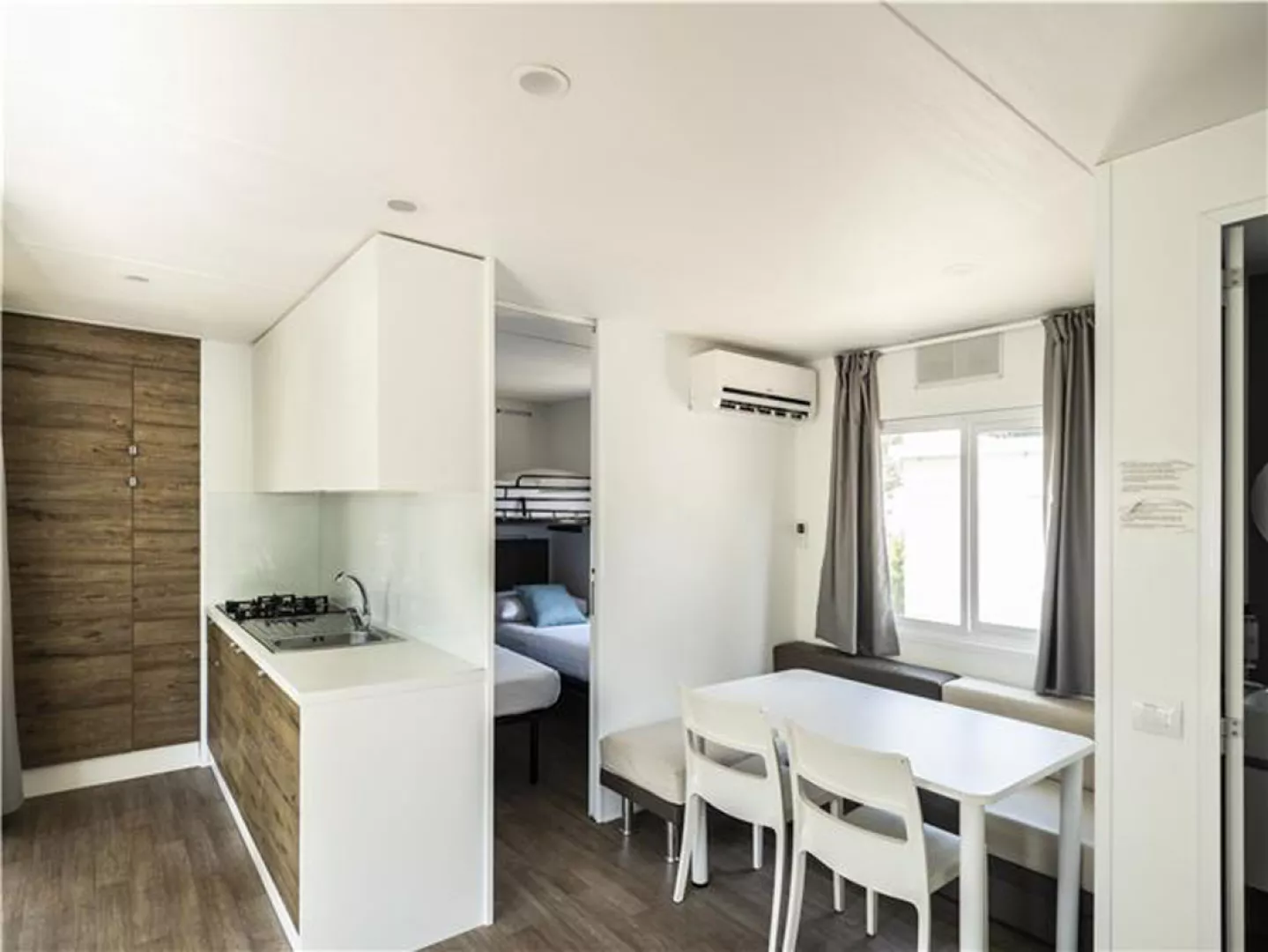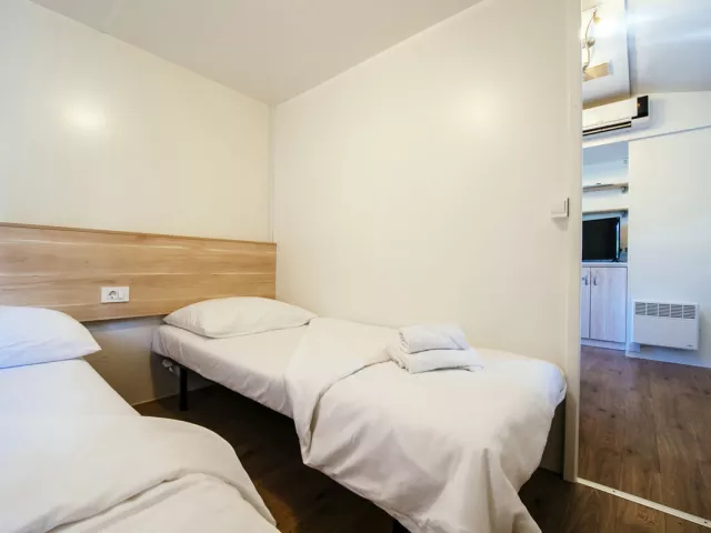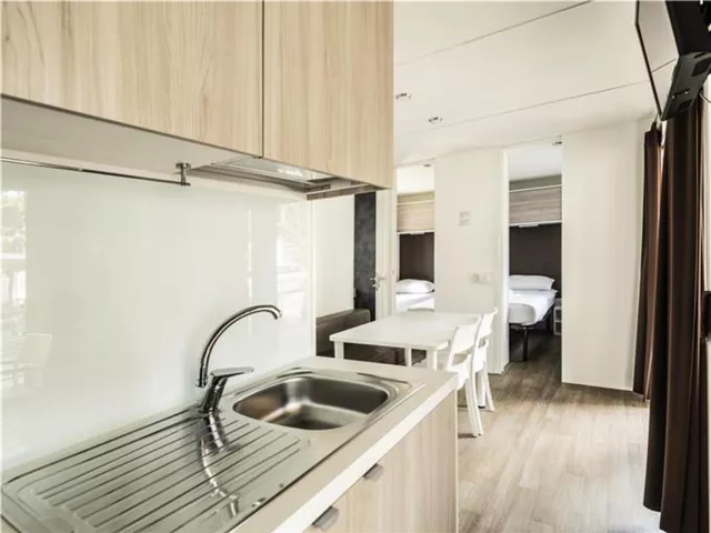 Mobilné domčeky sú rôzne typy a dĺžky (od 30 do 34 m²), obsahujú obývaciu miestnosť s kuchynským kútom, spálňu, sprchový kút a WC, SAT TV a Wi-Fi. Terasa so sedením je samozrejmosťou.