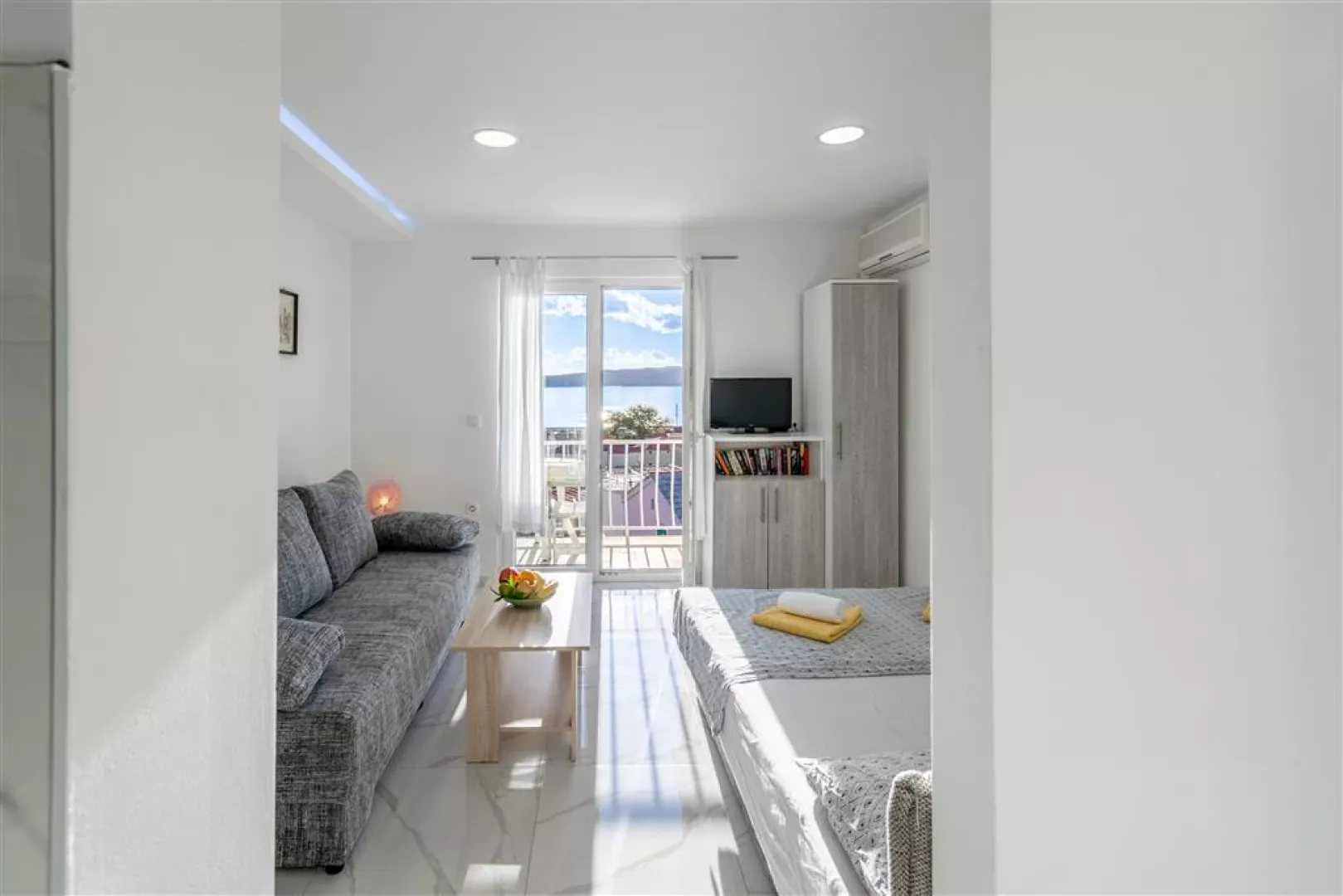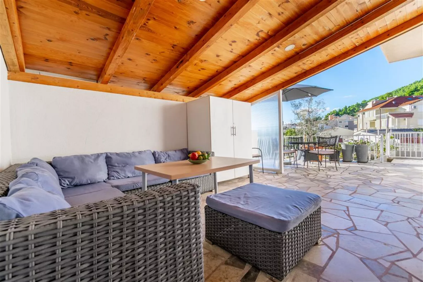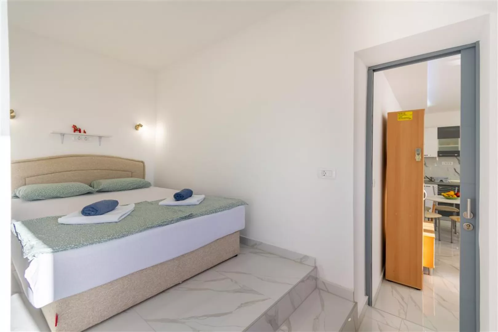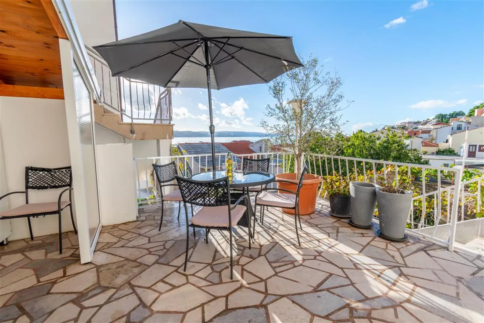 Privátna vila sa nachádza v tichej uličke na kopci, obklopená rodinnými vilami. K jednotlivým apartmánom je prístup po schodoch. Hlavná pobrežná promenáda a štrkovo-kamienková pláž sú vzdialené cca 300 m. Ležadlá a slnečníky na pláži sú k dispozícii za poplatok.
