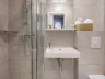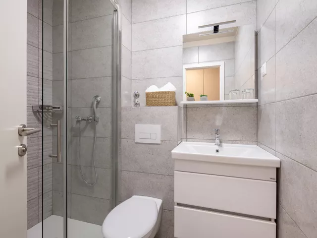 Baška Voda, centrum – 2 km, pláž / okruhliaková s betónovými platňami a pozvoľným vstupom do mora 25 až 200 m, FKK pláž – 400 m, letisko Split – 75 km, letisko Dubrovník – 137 km