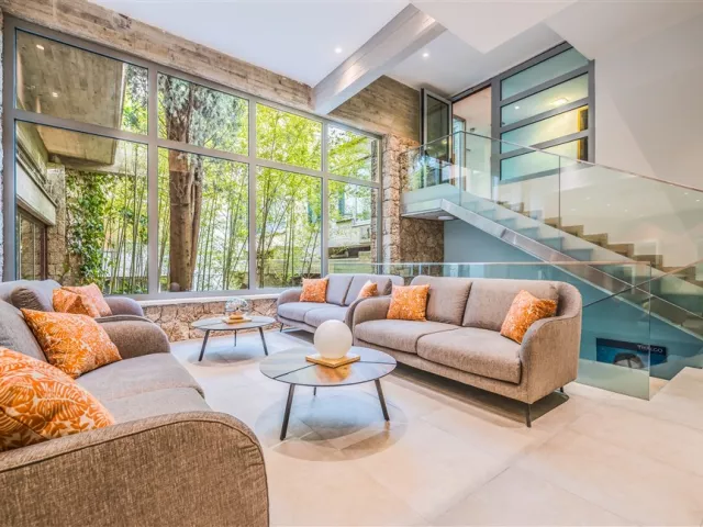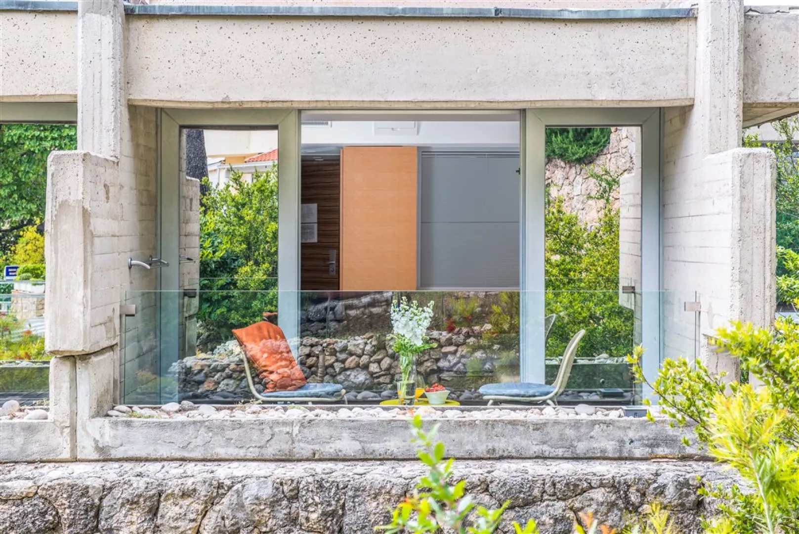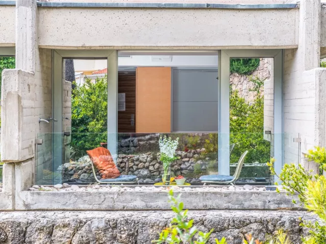 Pláž je jemná štrková a upravená skalami, oddelená promenádou a lemovaná borovicovým porastom, čo poskytuje prírodný tieň. Ležadlá a slnečníky sú k dispozícii za poplatok, ako aj vodné športy.