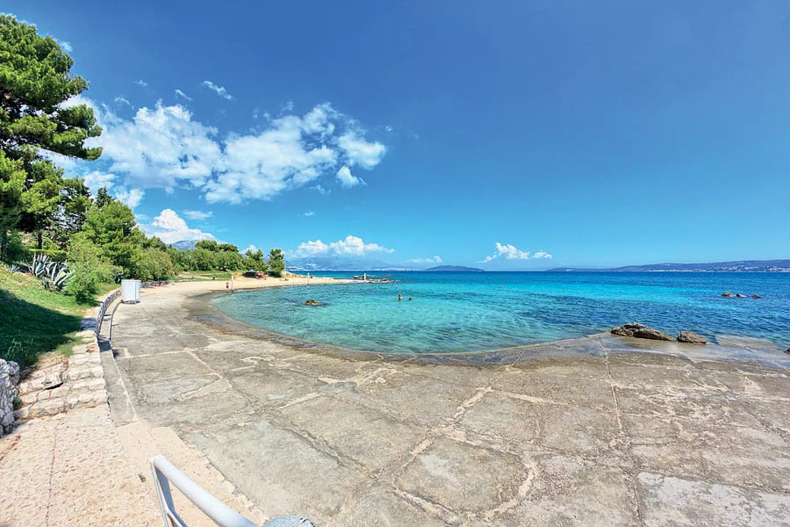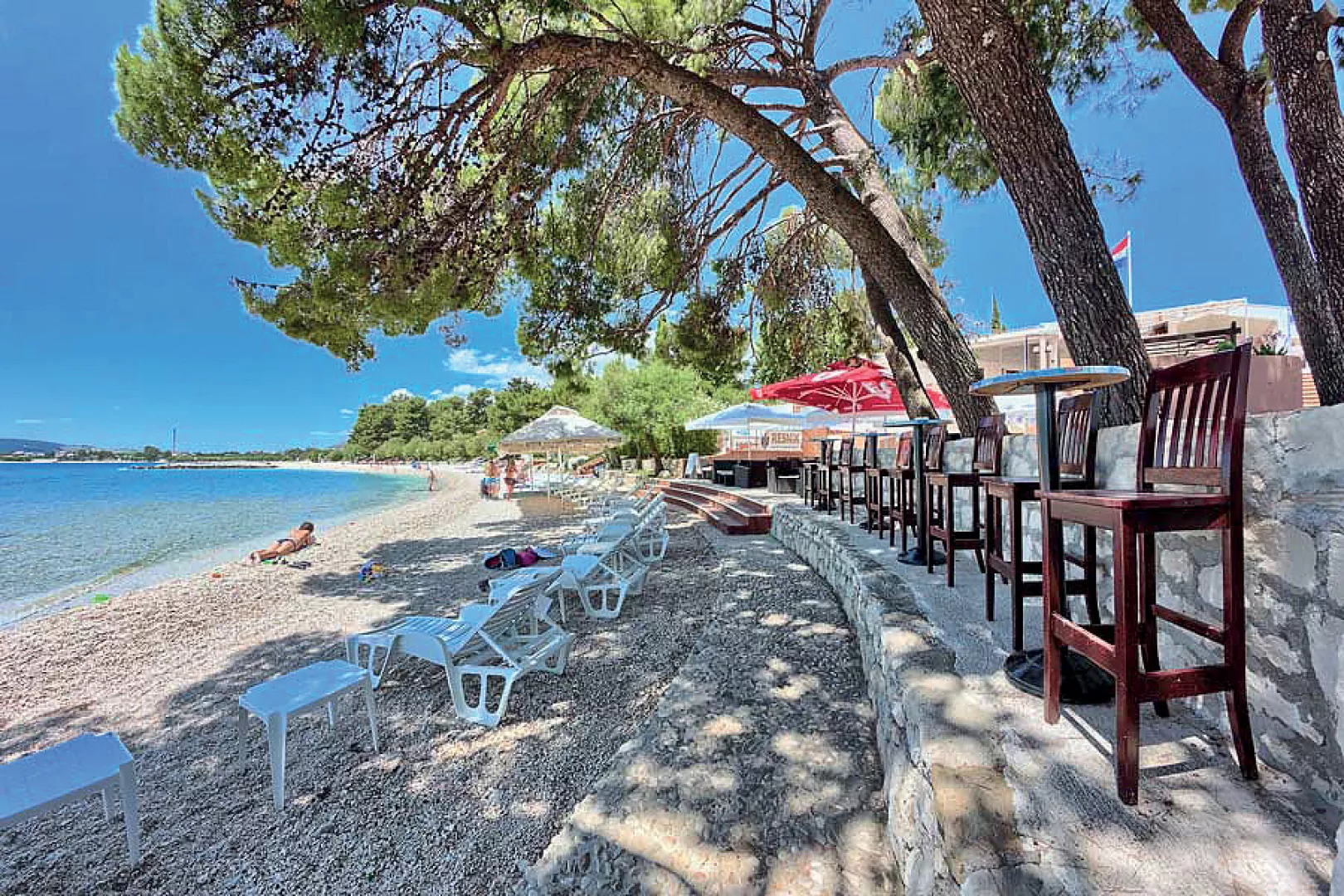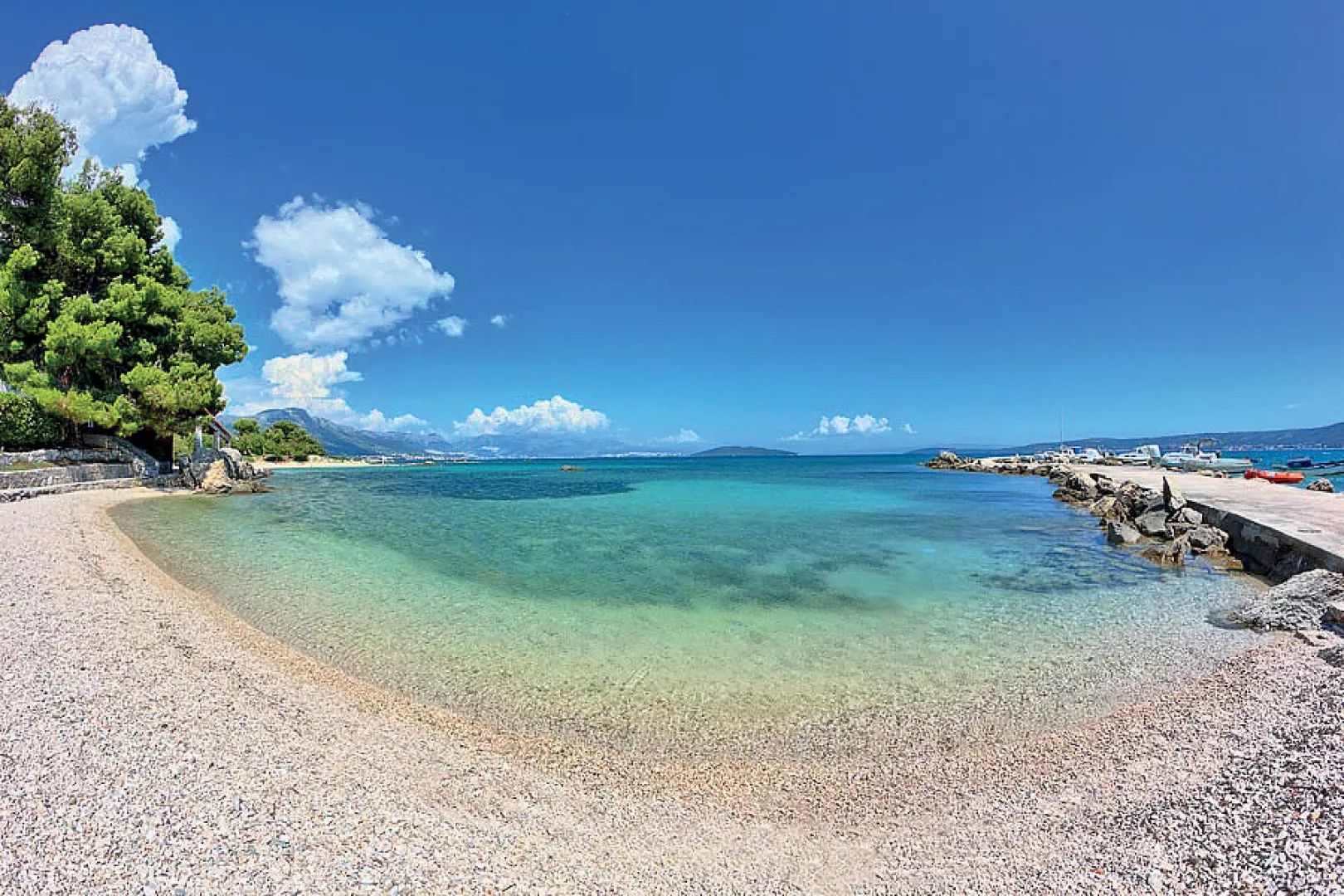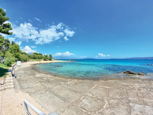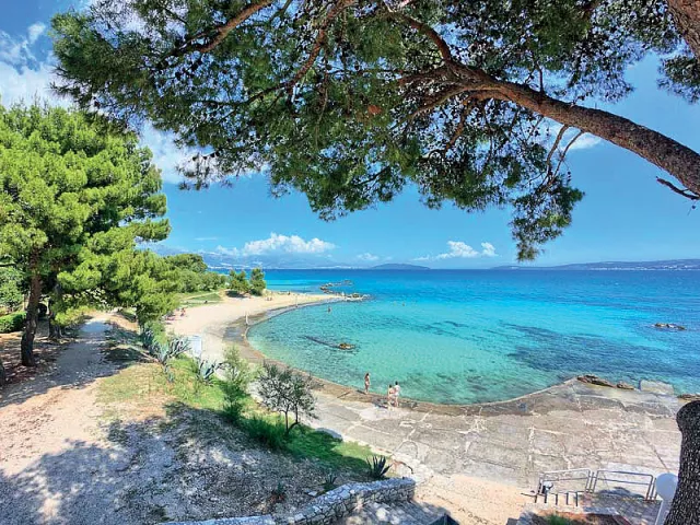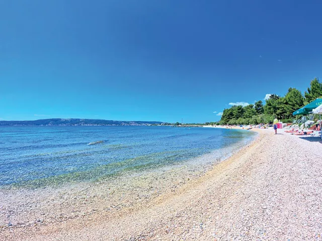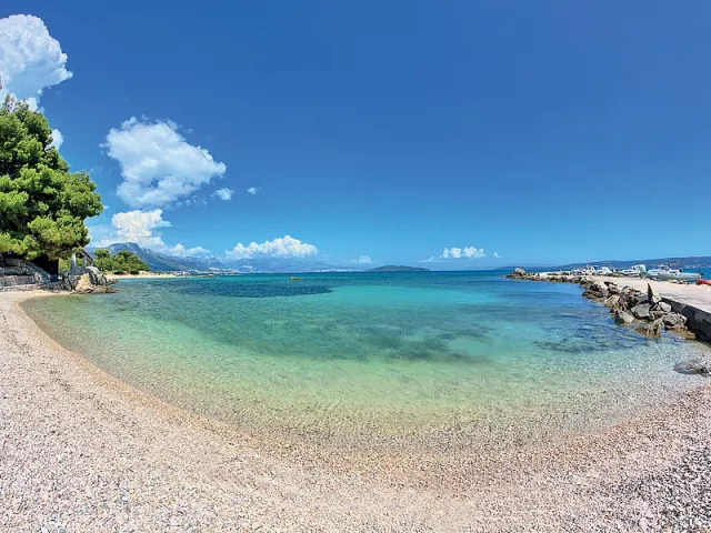 Kaštel Štafilić, centrum - 1 km, pláž / drobné kamienky, miestami až hrubší piesok s pozvoľným vstupom do mora, miestami betónové mólo s okruhliakovým dnom - 10 m, Trogir - 7 km