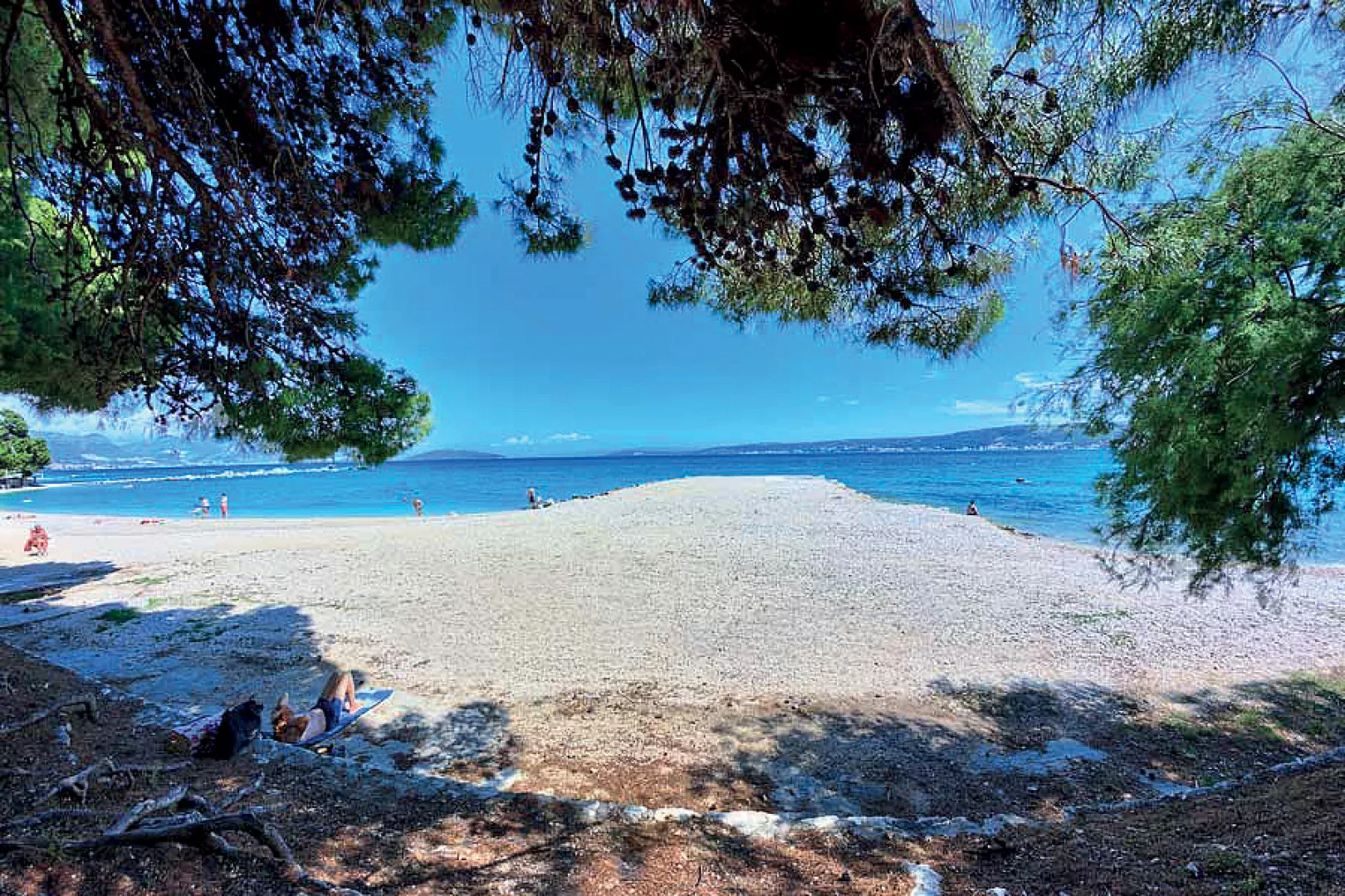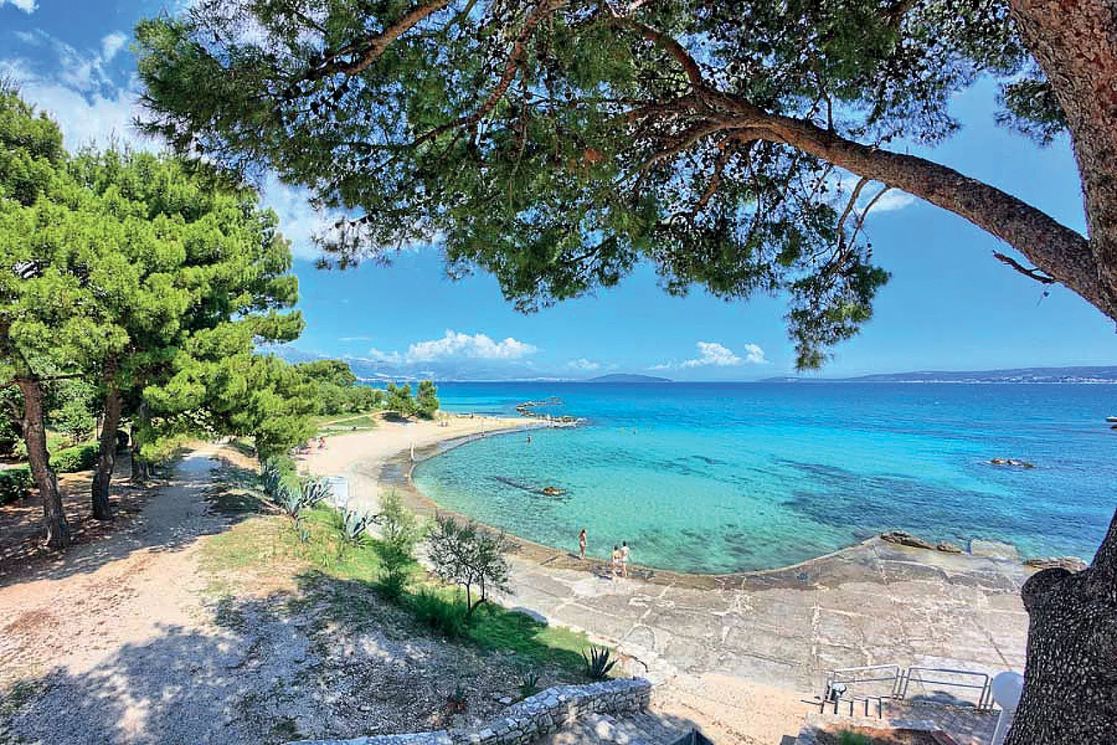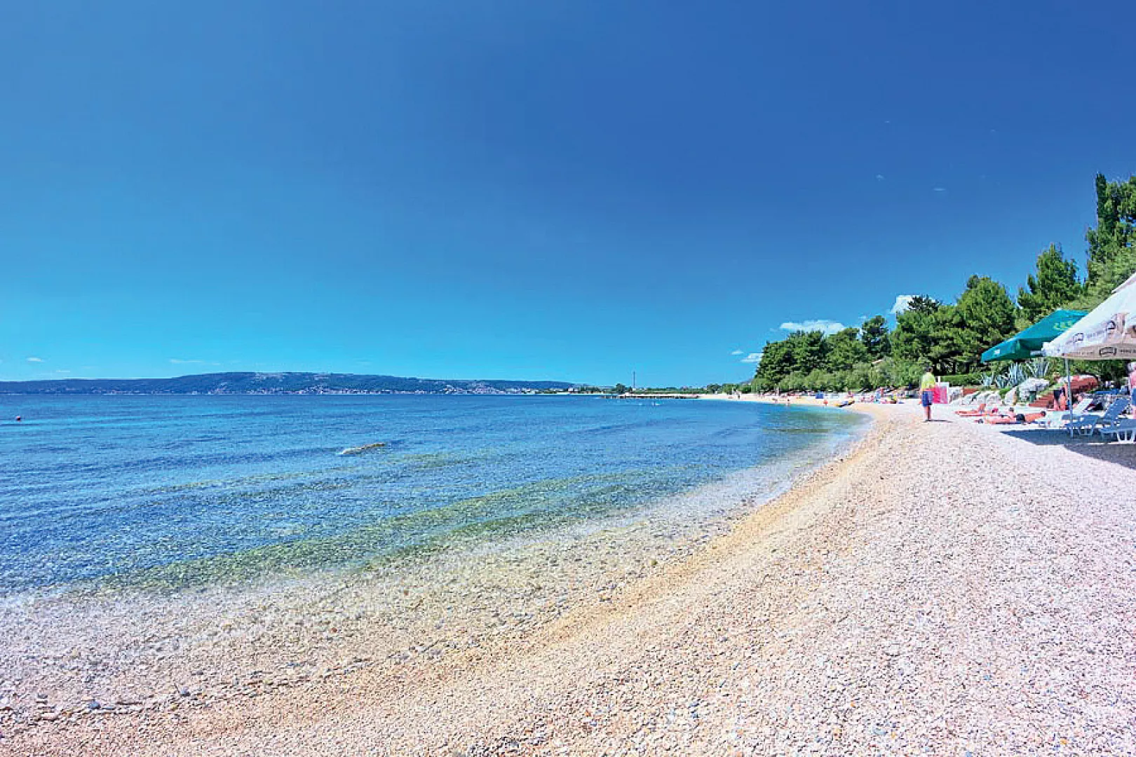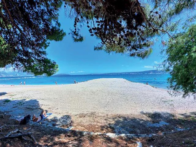 Kaštel Štafilić, centrum - 1 km, pláž / drobné kamienky, miestami až hrubší piesok s pozvoľným vstupom do mora, miestami betónové mólo s okruhliakovým dnom - 10 m, Trogir - 7 km