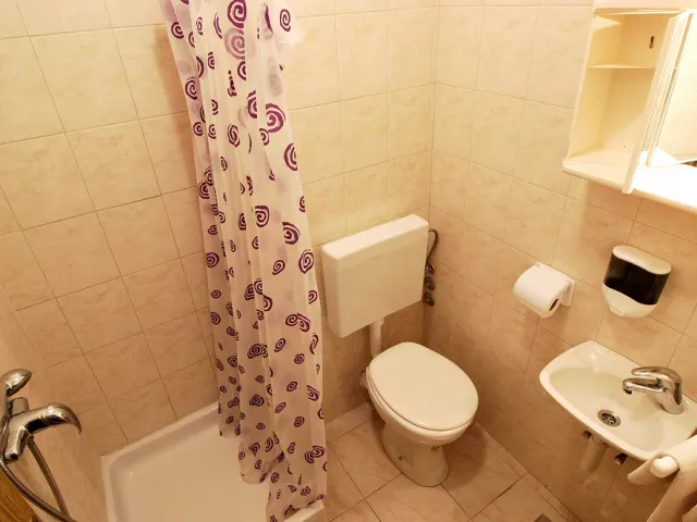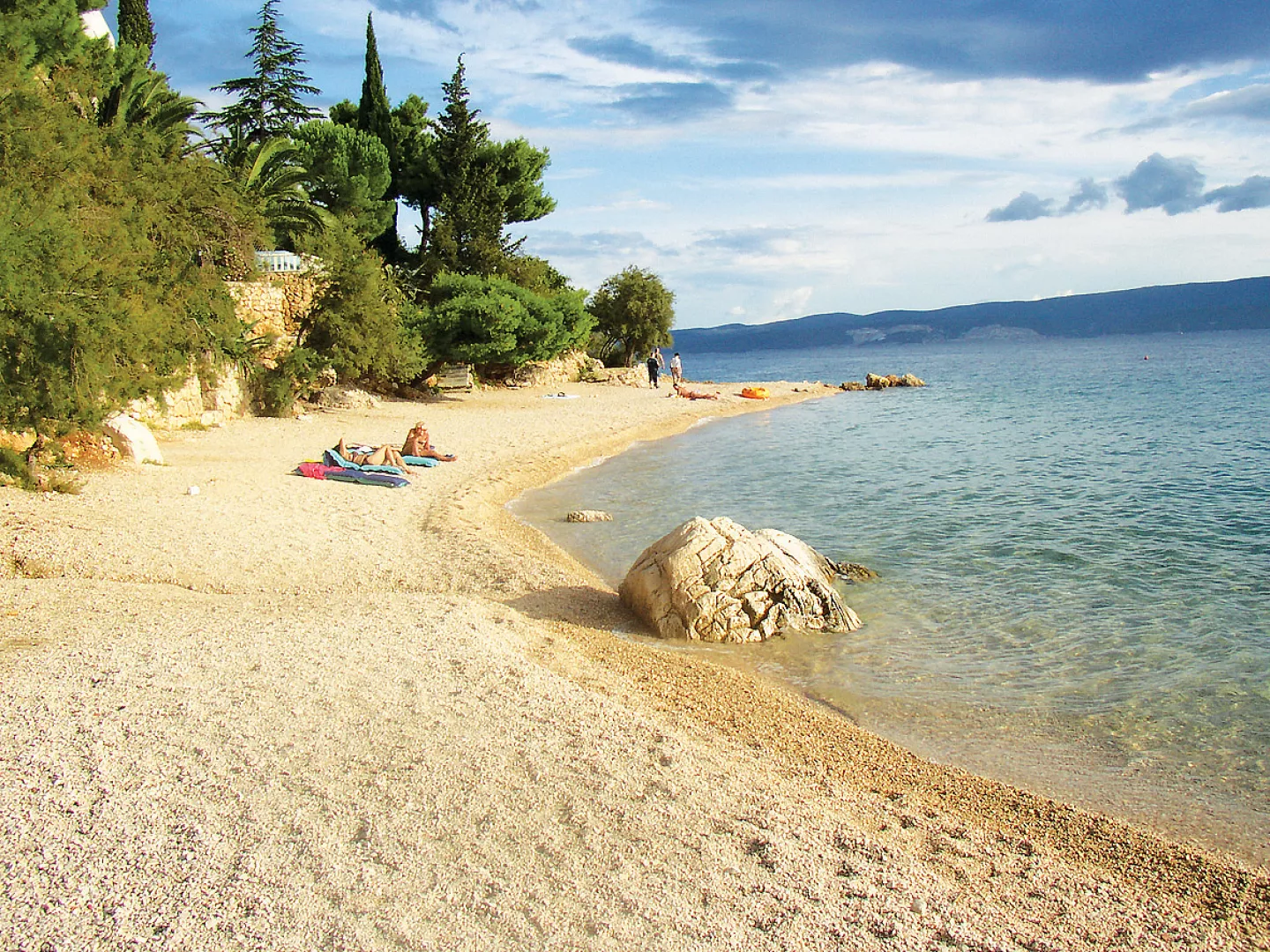 Pláž s jemným štrkom je vzdialená cca 300 m. Prístup na pláž je po schodoch, a ležadlá a slnečníky sú k dispozícii za poplatok.