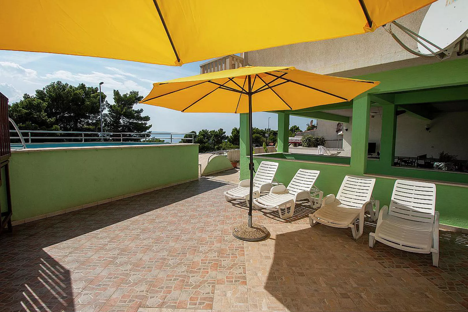 bazén, ležadlá so slnečníkmi