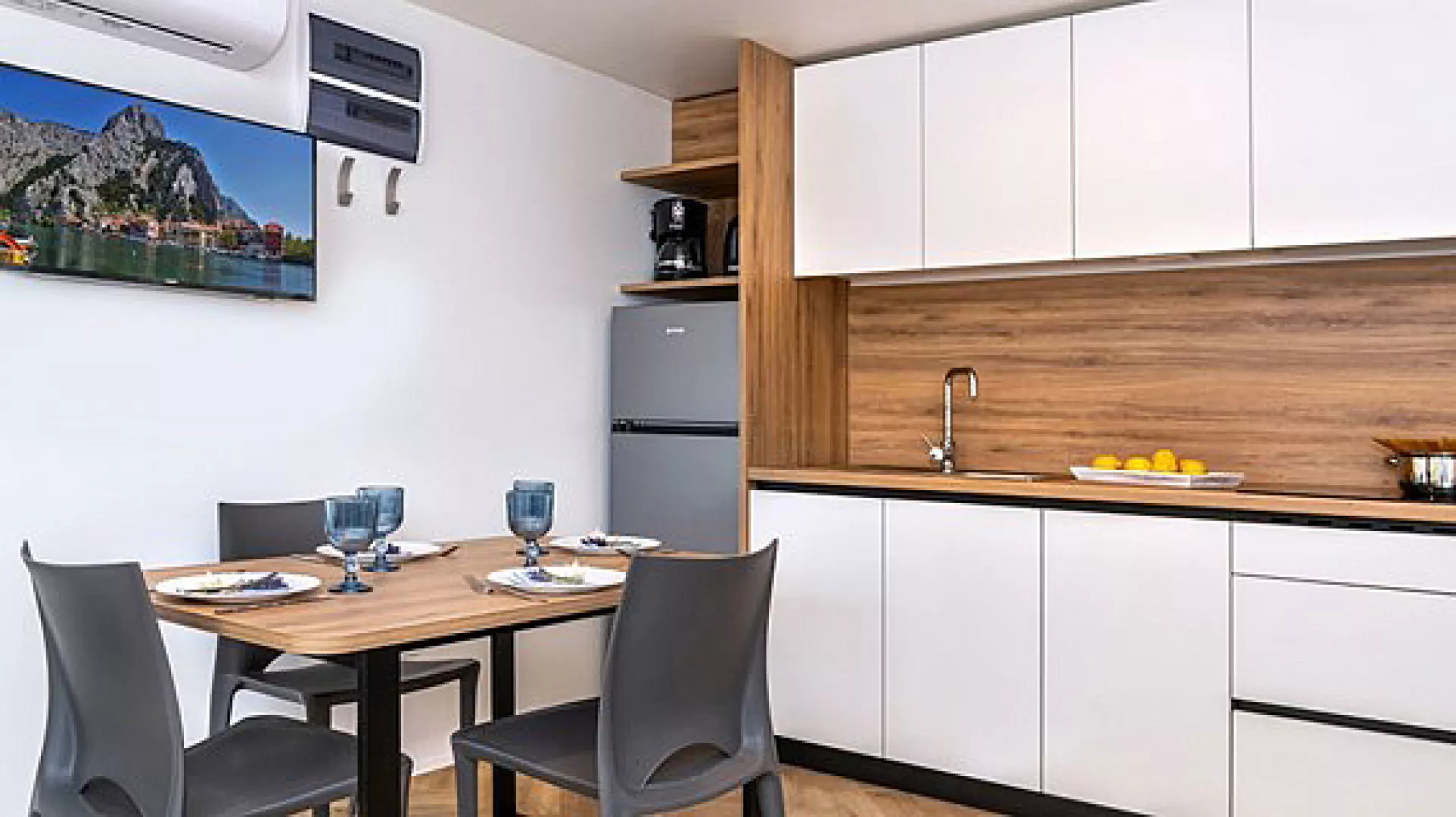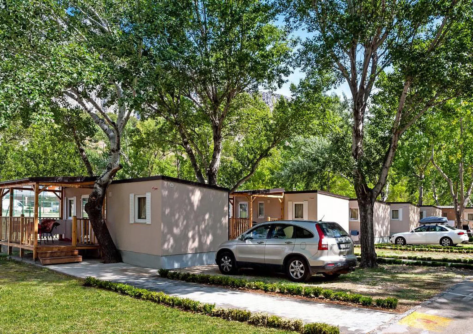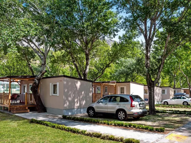 Areál sa nachádza v tieni borovicového lesa a mediteránskej vegetácie, priamo pri pláži. Mobilné domy sú orientované smerom k moru, približne 1,2 km od historického Omiša, ktorý leží v ústí rieky Cetina. V centre Omiša nájdete množstvo obchodíkov, reštaurácií, kaviarní, pizzerií a cukrární. Zároveň sa nachádza len 21 km od Splitu. Priestranná piesočnatá pláž s pozvoľným vstupom do mora sa rozprestiera pozdĺž celého rezortu a sú k dispozícii aj ležadlá na pláži (za poplatok). Pre tých, ktorí hľadajú dobrodružstvo, sú k dispozícii aj výlety, ako rafting na rieke Cetina a adrenalínová jazda Zip line.