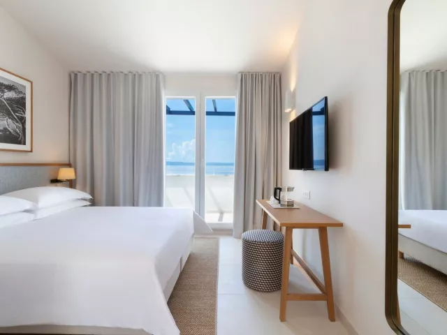 Pred hotelom sa nachádza štrková pláž, prístupná pohodlne cez promenádu. Na pláži sú k dispozícii ležadlá a slnečníky za poplatok, pričom uteráky sú na recepcii s vratnou kauciou.