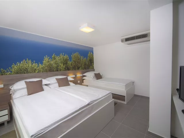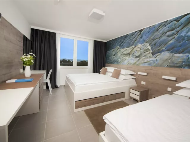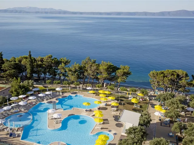 hotel Neptun a jeho päť dvojposchodových depandansov Maslinik tvoria komplex, ktorý sa nachádza priamo pri štrkovej pláži, od ktorej ho oddeľuje len prímorská promenáda • ležadlá a slnečníky na pláži za poplatok