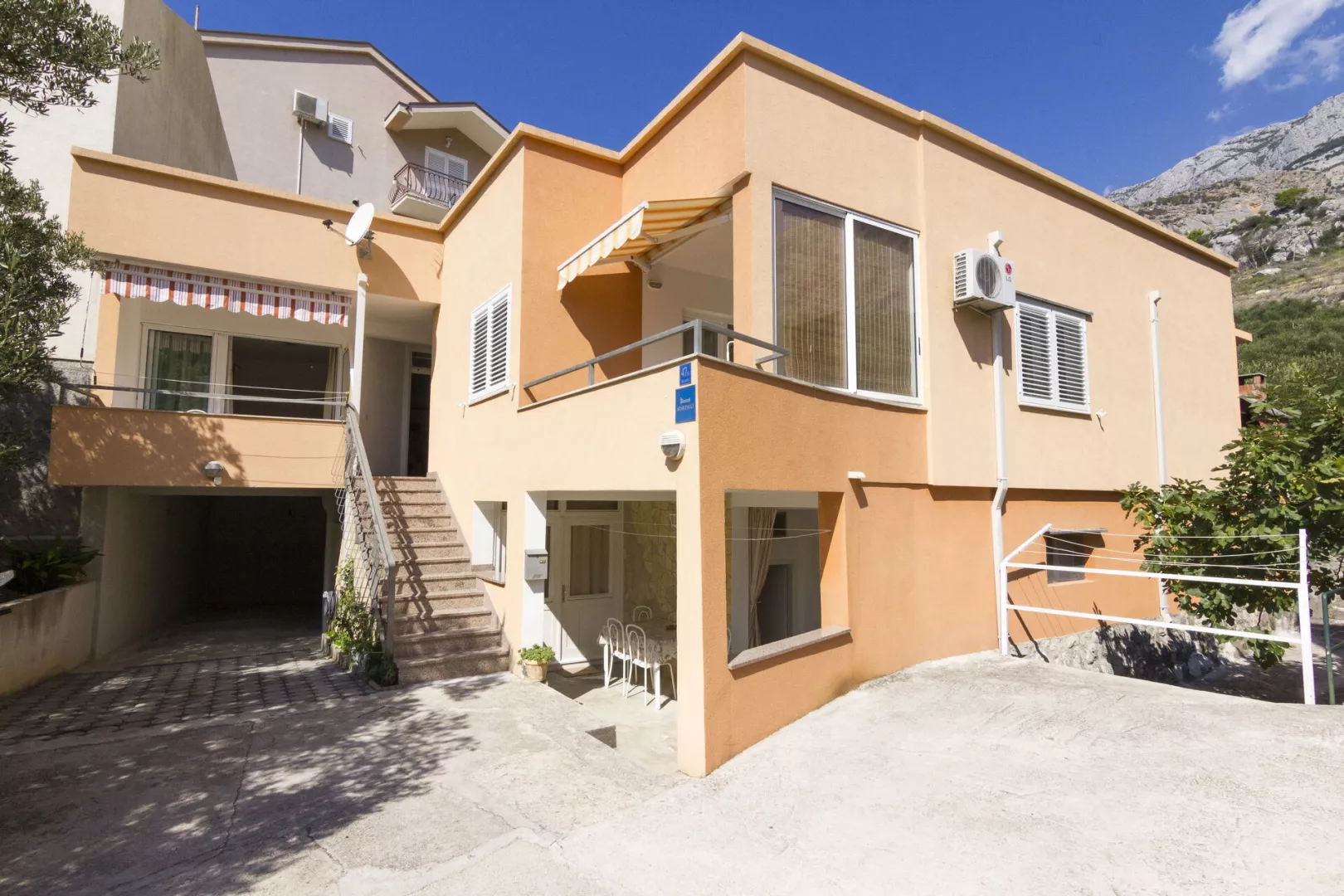 Apartmán je situovaný v stredisku Tučepi, na miernom svahu nad hotelom Alga, len asi 650 m od centra s prístavom.