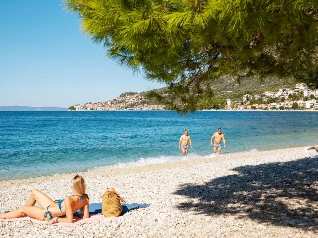 Jemno-štrková pláž sa nachádza priamo pod ubytovacím zariadením. K dispozícii sú ležadlá a slnečníky za poplatok, ako aj vodné športy a prenájom športových potrieb.