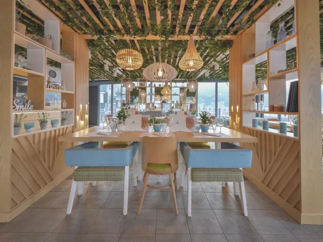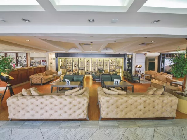 Hotel disponuje priestrannou vstupnou halou s recepciou a lobby barom, hlavnou hotelovou reštauráciou Crystal, barom pri bazéne Opera, a á la carte reštauráciou Amfora (za poplatok). Plážová reštaurácia Azurro (tiež za poplatok) ponúka jedlo priamo pri pláži. Vonkajší bazén má vyhradenú časť pre deti (ležadlá a slnečníky zdarma, plážové osušky za vratný depozit). SPA a wellness centrum s vnútorným bazénom je prístupné zdarma, zatiaľ čo služby balneoterapie, masáže a kozmetické procedúry sú za poplatok. Rovnako sú k dispozícii telocvičňa, detský klub (za poplatok), detské ihrisko a parkovisko (tiež za poplatok). Hotel má kongresové centrum a veľký aquapark s rozlohou 7500 m², ktorý je otvorený v júli a auguste a ponúka rôzne bazény a tobogány. V priestoroch aquaparku sa nachádza reštaurácia Kaskada (za poplatok).