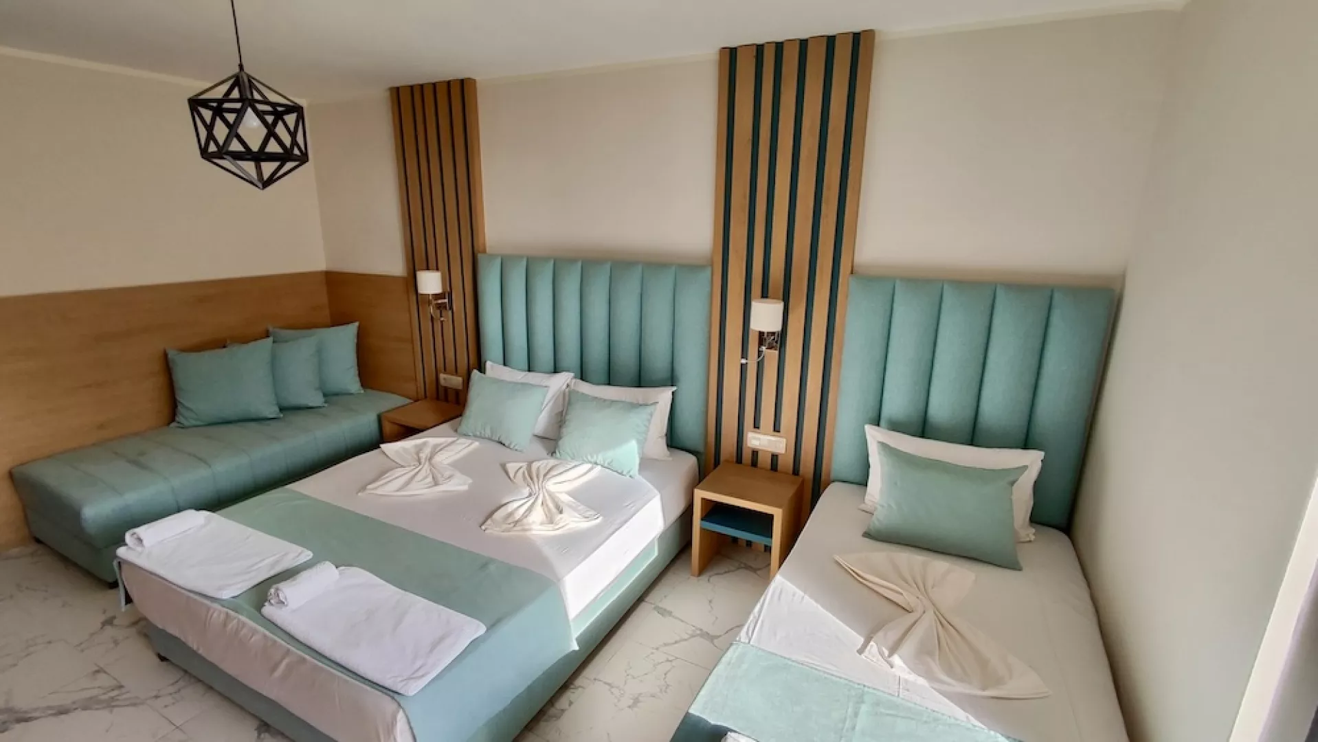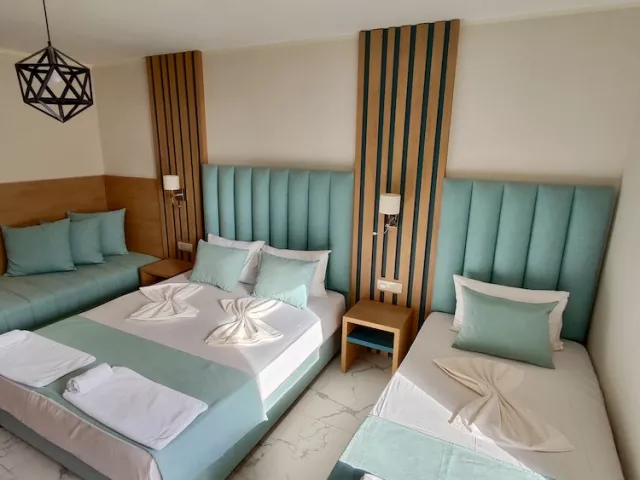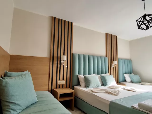 Vybavenie izieb zahŕňa TV/SAT, telefón, klimatizáciu, minichladničku, vlastné sociálne zariadenie, sušič na vlasy a balkón. Detská postieľka je k dispozícii na vyžiadanie zdarma. Vybavenie hotela zahŕňa recepciu, bezplatné WiFi v areáli hotela, hlavnú reštauráciu, bar pri bazéne, lounge bar, plážový bar, vonkajší bazén pre dospelých a bazén pre deti, slnečníky a ležadlá pri bazéne (zdarma), vnútorné a vonkajšie detské ihrisko, spa centrum a wellness centrum, masáže za poplatok.