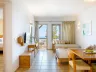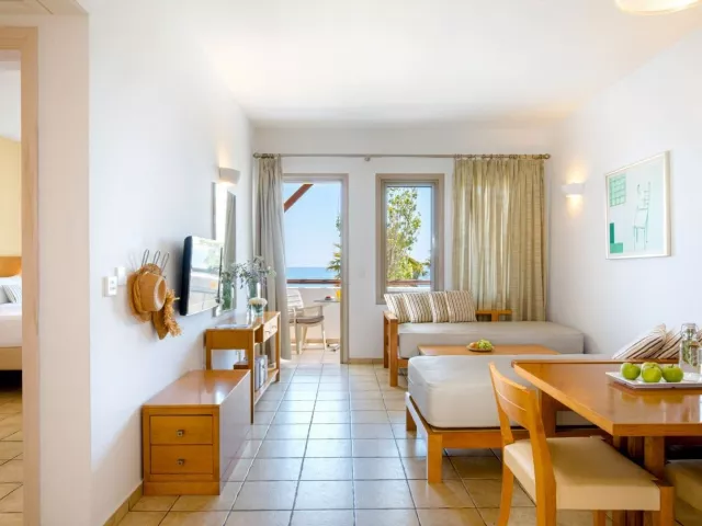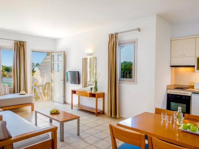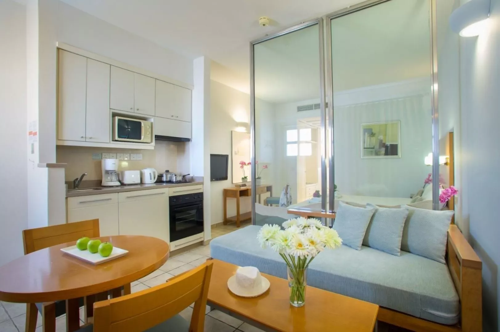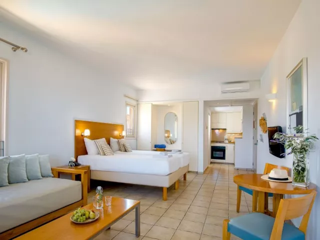 Izby sú vybavené pre maximálne 2 dospelých s dieťaťom na prístelke v štúdiu s rozlohou cca 32 m², ktoré obsahuje TV, telefón, trezor a kuchynku (mikrovlnná rúra, príslušenstvo na prípravu kávy/čaju, mini chladnička, varná plocha). K dispozícii je aj vlastné sociálne zariadenie (WC, vaňa alebo sprchovací kút, sušič vlasov) a balkón alebo terasa so stolom a stoličkami. Apartmány sú k dispozícii s oddelenou obývacou časťou a môžu obsahovať až dve prístelky v podobe rozkladacej pohovky, s možnosťou výberu medzi jednou či dvoma spálňami.