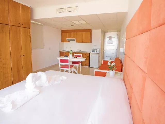 Hotel ponúka rôzne typy apartmánov, ktoré sú vybavené moderným nábytkom a všetkými potrebnými zariadeniami na pohodlný pobyt. Izby sú klimatizované a disponujú kuchynským kútom, ktorý zabezpečuje flexibilitu počas vašej dovolenky.