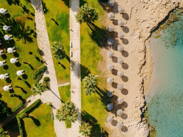 Priami pri hoteli • piesočnato-kamienková pláž s pozvoľným vstupom do mora • ležadlá a slnečníky na pláži zdarma • možnosť vodných športov (za poplatok)